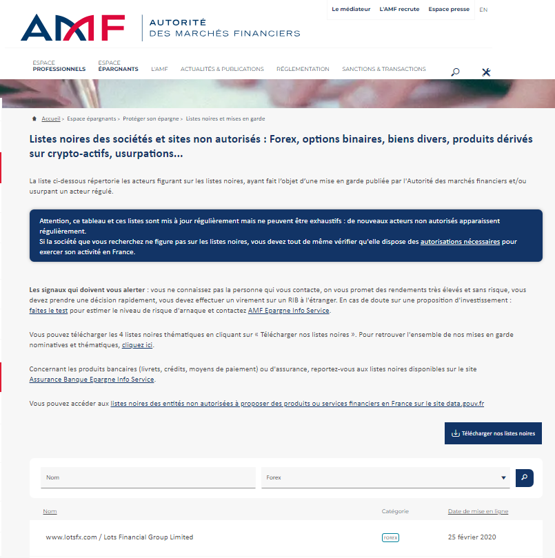 This is a list of the Autorité des Marchés Financiers (AMF) blacklisted companies or websites, warnings and/or usurpations of regulated companies.