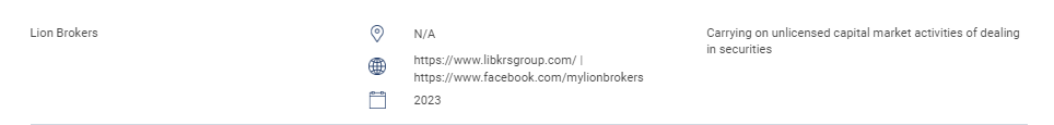 "This section contains the list of unauthorised websites, investment products, companies and individuals. This list includes: Persons carrying on or hold himself out as carrying on the following regulated activities without a licence from the SC: Dealing in securities; Dealing in derivatives;Fund management; Advising on corporate finance; Investment advice; Financial planning; and Dealing in private retirement schemes. Persons operating a recognised market without authorisation. Persons issuing or offering securities without approval, authorisation or recognition. Persons misusing SC’s logo and misrepresenting the SC. " Lion Brokers N/A https://www.libkrsgroup.com/ | https://www.facebook.com/mylionbrokers 2023 Carrying on unlicensed capital market activities of dealing in securities