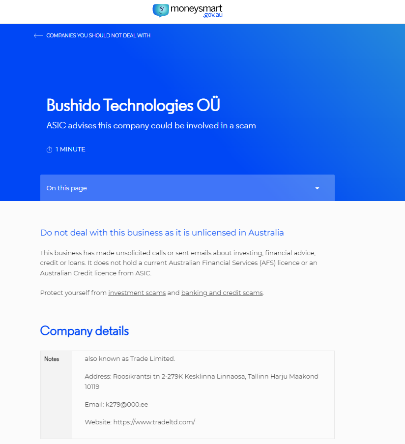 investor alert list Bushido Technologies OÜ ASIC advises this company could be involved in a scam