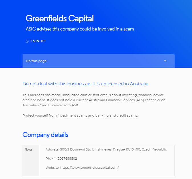 Greenfields Capital ASIC advises this company could be involved in a scam PAGE READING TIME:1 MINUTE On this page Do not deal with this business as it is unlicensed in Australia This business has made unsolicited calls or sent emails about investing, financial advice, credit or loans. It does not hold a current Australian Financial Services (AFS) licence or an Australian Credit licence from ASIC. Protect yourself from investment scams and banking and credit scams. Company details Notes Address: 500/9 Dopravni Str, Ulhzhineves, Prague 10, 10400, Czech Republic Ph: +442037699502 Website: https://www.greenfieldscapital.com/
