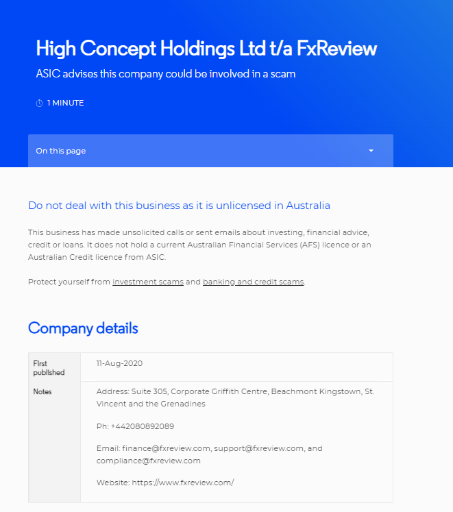 High Concept Holdings Ltd t/a FxReview ASIC advises this company could be involved in a scam PAGE READING TIME:1 MINUTE On this page Do not deal with this business as it is unlicensed in Australia This business has made unsolicited calls or sent emails about investing, financial advice, credit or loans. It does not hold a current Australian Financial Services (AFS) licence or an Australian Credit licence from ASIC. Protect yourself from investment scams and banking and credit scams. Company details First published 11-Aug-2020 Notes Address: Suite 305, Corporate Griffith Centre, Beachmont Kingstown, St. Vincent and the Grenadines Ph: +442080892089 Email: finance@fxreview.com, support@fxreview.com, and compliance@fxreview.com Website: https://www.fxreview.com/