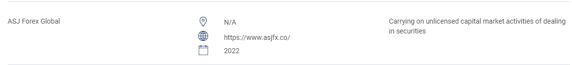 "This section contains the list of unauthorised websites, investment products, companies and individuals. This list includes: Persons carrying on or hold himself out as carrying on the following regulated activities without a licence from the SC: Dealing in securities; Dealing in derivatives;Fund management; Advising on corporate finance; Investment advice; Financial planning; and Dealing in private retirement schemes. Persons operating a recognised market without authorisation. Persons issuing or offering securities without approval, authorisation or recognition. Persons misusing SC’s logo and misrepresenting the SC. " ASJ Forex Global N/A https://www.asjfx.co/ 2022 Carrying on unlicensed capital market activities of dealing in securities