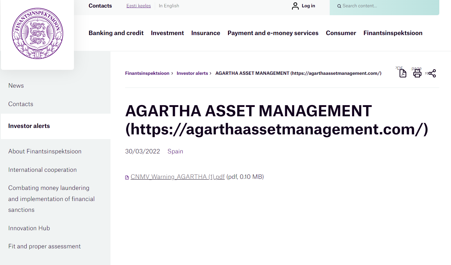 Investor alerts - AGARTHA ASSET MANAGEMENT