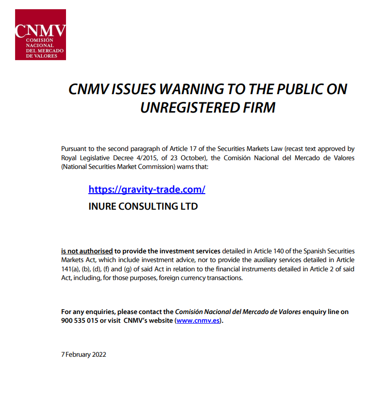 Pursuant to the second paragraph of Article 17 of the Securities Markets Law (recast text approved by Royal Legislative Decree 4/2015, of 23 October), the Comisión Nacional del Mercado de Valores (National Securities Market Commission) warns that: INURE CONSULTING LTD is not authorised to provide the investment services detailed in Article 140 of the Spanish Securities Markets Act, which include investment advice, nor to provide the auxiliary services detailed in Article 141(a), (b), (d), (f) and (g) of said Act in relation to the financial instruments detailed in Article 2 of said Act, including, for those purposes, foreign currency transactions.