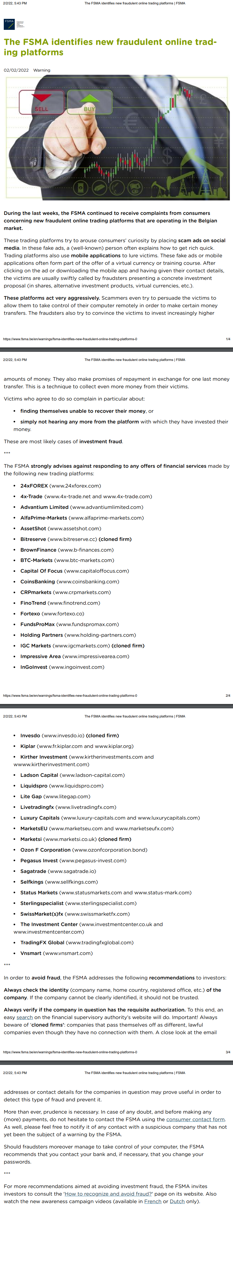 FSMA warning 02/02/2022 Belgium The FSMA identifies new fraudulent online trading platforms 2/2/22, warning During the last weeks, the FSMA continued to receive complaints from consumers concerning new fraudulent online trading platforms that are operating in the Belgian market. These trading platforms try to arouse consumers’ curiosity by placing scam ads on social media. In these fake ads, a (well-known) person often explains how to get rich quick. Trading platforms also use mobile applications to lure victims. These fake ads or mobile applications often form part of the offer of a virtual currency or training course. After clicking on the ad or downloading the mobile app and having given their contact details, the victims are usually swiftly called by fraudsters presenting a concrete investment proposal (in shares, alternative investment products, virtual currencies, etc.). These platforms act very aggressively. Scammers even try to persuade the victims to allow them to take control of their computer remotely in order to make certain money transfers. The fraudsters also try to convince the victims to invest increasingly higher amounts of money. They also make promises of repayment in exchange for one last money transfer. This is a technique to collect even more money from their victims. Victims who agree to do so complain in particular about: finding themselves unable to recover their money, or simply not hearing any more from the platform with which they have invested their money. These are most likely cases of investment fraud. *** The FSMA strongly advises against responding to any offers of financial services made by the following new trading platforms: 24xFOREX (www.24xforex.com) 4x-Trade (www.4x-trade.net and www.4x-trade.com) Advantium Limited (www.advanti umlimited.com) · AlfaPrime-Markets (www.alfaprime-markets.com) AssetShot (www.assetshot.com) Bitreserve (www.bitreserve.cc) (cloned firm) BrownFinance (www.b-finances.com) BTC-Markets (www.btc-markets.com) Capital Of Focus (www.capitaloffocus.com) CoinsBanking (www.coinsbanking.com) CRPmarkets (www.crpmarkets.com) FinoTrend (www.finotrend.com) · Fortexo (www.fortexo.co) FundsProMax (www.fundspromax.com) Holding Partners (www.holding-partners.com) IGC Markets (www.igcmarkets.com) (cloned firm) Impressive Area (www.impressivearea.com) · InGoInvest (www.ingoinvest.com) · Invesdo (www.invesdo.io) (cloned firm) Kiplar (www.fr.kip lar.com and www.kip lar.org) Kirther Investment (www.kirther investments.com and wwww.kirther investment.com) Ladson Capital (www.ladson-capital.com) Liquidspro (www.liquidspro.com) Lite Gap (www.litegap.com) Livetradingfx (www.livetradingfx.com) Luxury Capitals (www.luxury-capitals.com and www.luxurycapitals.com) MarketsEU (www.marketseu.com and www.marketseufx.com) Marketsi (www.marketsi.co.uk) (cloned firm) · Ozon F Corporation (www.ozonfcorporation.bond) Pegasus Invest (www.pegasus-invest.com) Sagatrade (www.sagatrade.io) Selfkings (www.sellfkings.com) Status Markets (www.statusmarkets.com and www.status-mark.com) Sterlingspecialist (www.sterlingspecialist.com) SwissMarket(s)fx (www.swissmarketfx.com) The Investment Center (www.investmentcenter.co.uk and www.investmentcenter.com) TradingFX Global (www.tradingfxglobal.com) · Vnsmart (www.vnsmart.com) *** In order to avoid fraud, the FSMA addresses the following recommendations to investors: Always check the identity (company name, home country, registered office, etc.) of the company. If the company cannot be clearly identified, it should not be trusted. Always verify if the company in question has the requisite authorization. To this end, an easy search on the financial supervisory authority’s website will do. Important! Always beware of ‘cloned firms’ : companies that pass themselves off as different, lawful companies even though they have no connection with them. A close look at the email addresses or contact details for the companies in question may prove useful in order to detect this type of fraud and prevent it. More than ever, prudence is necessary. In case of any doubt, and before making any (more) payments, do not hesitate to contact the FSMA using the consumer contact form. As well, please feel free to notify it of any contact with a suspicious company that has not yet been the subject of a warning by the FSMA. Should fraudsters moreover manage to take control of your computer, the FSMA recommends that you contact your bank and, if necessary, that you change your passwords. *** For more recommendations aimed at avoiding investment fraud, the FSMA invites investors to consult the 'How to recognize and avoid fraud?' page on its website. Also watch the new awareness campaign videos (available in French or Dutch only).