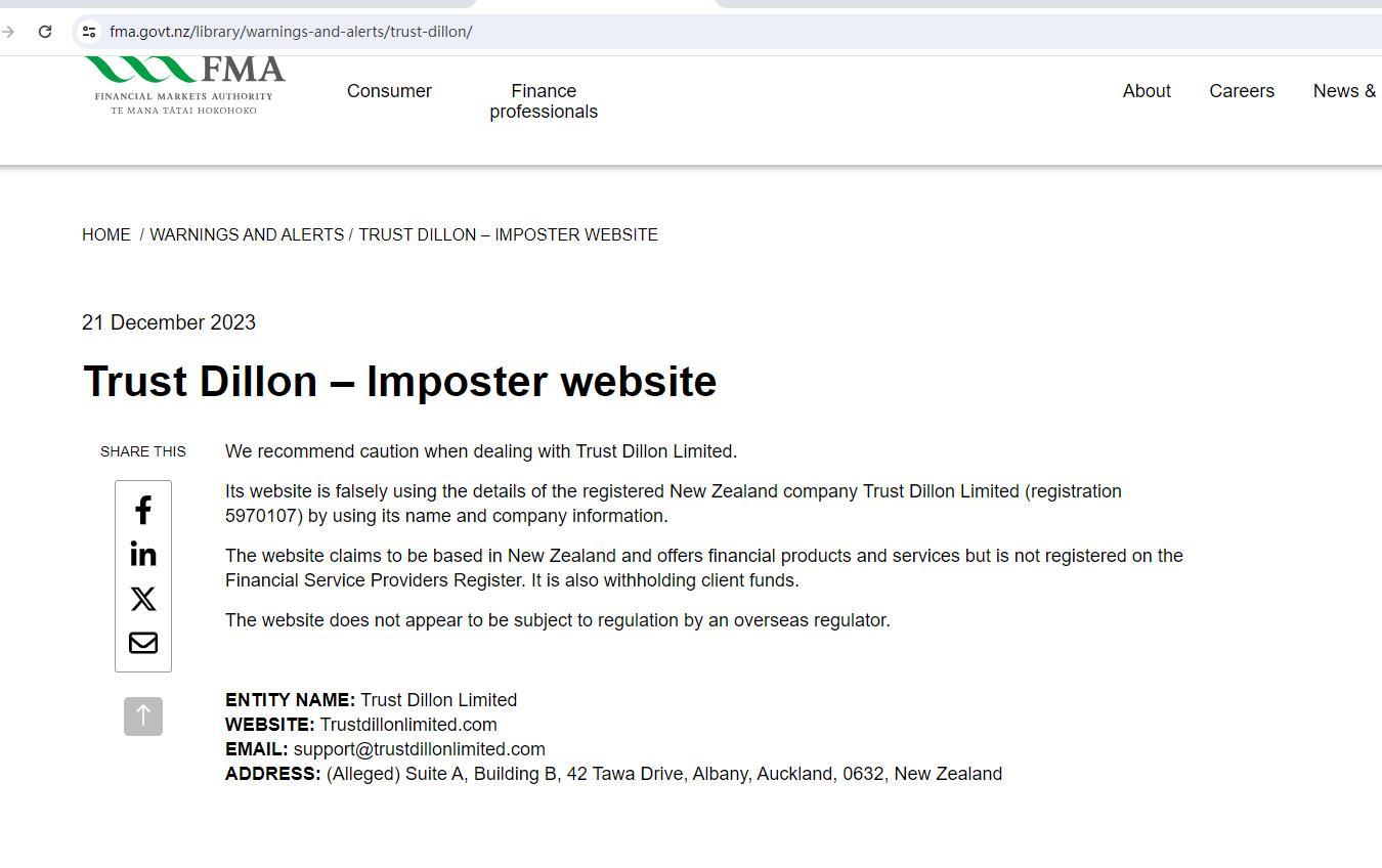 Trust Dillon – Imposter website We recommend caution when dealing with Trust Dillon Limited. Its website is falsely using the details of the registered New Zealand company Trust Dillon Limited (registration 5970107) by using its name and company information. The website claims to be based in New Zealand and offers financial products and services but is not registered on the Financial Service Providers Register. It is also withholding client funds. The website does not appear to be subject to regulation by an overseas regulator. ENTITY NAME: Trust Dillon Limited WEBSITE: Trustdillonlimited.com EMAIL: support@trustdillonlimited.com ADDRESS: (Alleged) Suite A, Building B, 42 Tawa Drive, Albany, Auckland, 0632, New Zealand