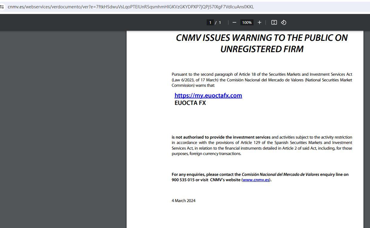 CNMV ISSUES WARNING TO THE PUBLIC ON UNREGISTERED FIRM Pursuant to the second paragraph of Article 18 of the Securities Markets and Investment Services Act (Law 6/2023, of 17 March) the Comisión Nacional del Mercado de Valores (National Securities Market Commission) warns that: https://my.euoctafx.com EUOCTA FX is not authorised to provide the investment services and activities subject to the activity restriction in accordance with the provisions of Article 129 of the Spanish Securities Markets and Investment Services Act is not authorised to provide the investment services and activities subject to the activity restriction in accordance with the provisions of Article 129 of the Spanish Securities Markets and Investment Services Act, in relation to the financial instruments detailed in Article 2 of said Act, including, for those purposes, foreign currency transactions. For any enquiries, please contact the Comisión Nacional del Mercado de Valores enquiry line on 900 535 015 or visit CNMV’s website (www.cnmv.es). 4 March 2024