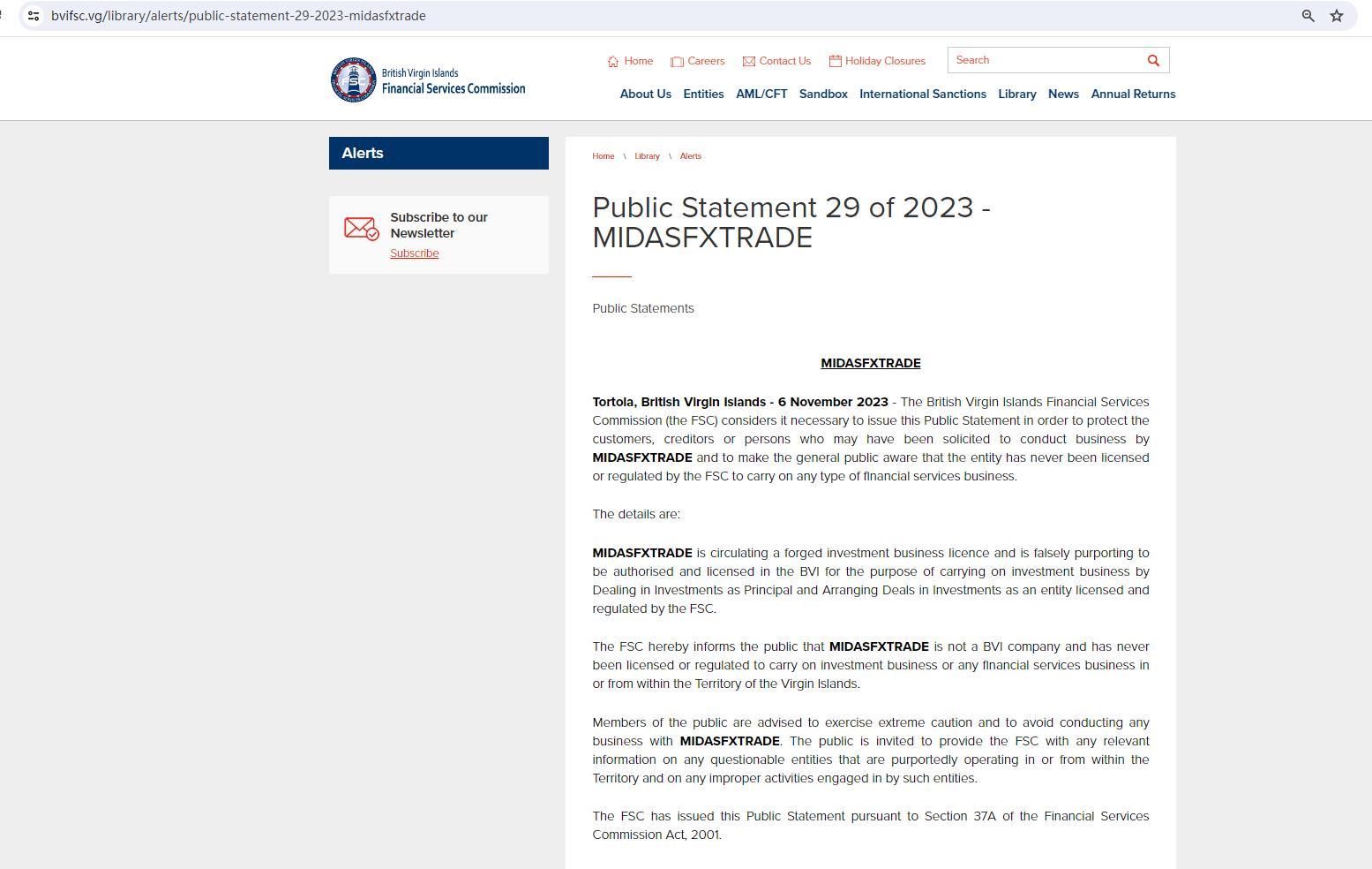 Public Statement 29 of 2023 - MIDASFXTRADE Public Statements MIDASFXTRADE Tortola, British Virgin Islands - 6 November 2023 - The British Virgin Islands Financial Services Commission (the FSC) considers it necessary to issue this Public Statement in order to protect the customers, creditors or persons who may have been solicited to conduct business by MIDASFXTRADE and to make the general public aware that the entity has never been licensed or regulated by the FSC to carry on any type of financial services business. The details are: MIDASFXTRADE is circulating a forged investment business licence and is falsely purporting to be authorised and licensed in the BVI for the purpose of carrying on investment business by Dealing in Investments as Principal and Arranging Deals in Investments as an entity licensed and regulated by the FSC. The FSC hereby informs the public that MIDASFXTRADE is not a BVI company and has never been licensed or regulated to carry on investment business or any financial services business in or from within the Territory of the Virgin Islands. Members of the public are advised to exercise extreme caution and to avoid conducting any business with MIDASFXTRADE. The public is invited to provide the FSC with any relevant information on any questionable entities that are purportedly operating in or from within the Territory and on any improper activities engaged in by such entities. The FSC has issued this Public Statement pursuant to Section 37A of the Financial Services Commission Act, 2001.
