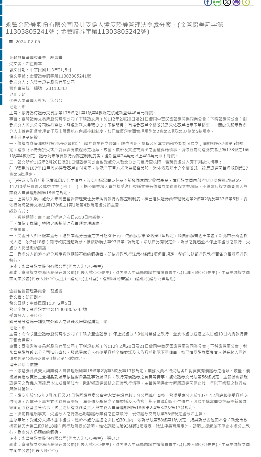 永豐金證券股份有限公司Cases of punishment for violating securities management laws and regulations by its employees. (Financial Securities Co., Ltd. No. 11303805241; Financial Management Securities Co., Ltd. No. 11303805242)