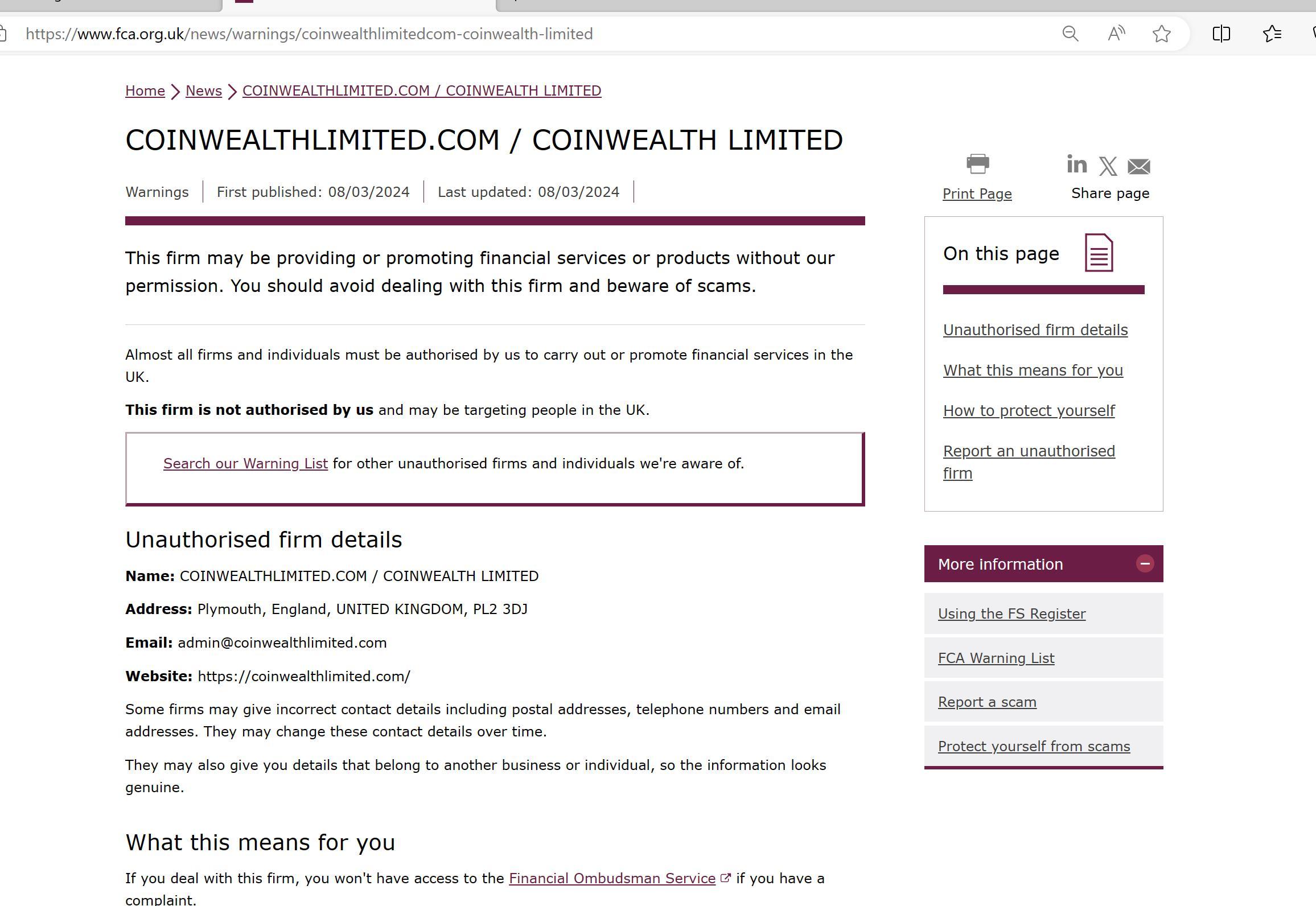 First published: 08/03/2024 Last updated: 08/03/2024 This firm may be providing or promoting financial services or products without our permission. You should avoid dealing with this firm and beware of scams. Almost all firms and individuals must be authorised by us to carry out or promote financial services in the UK. This firm is not authorised by us and may be targeting people in the UK. Unauthorised firm details Name: COINWEALTHLIMITED.COM / COINWEALTH LIMITED Address: Plymouth, England, UNITED KINGDOM, PL2 3DJ Email: admin@coinwealthlimited.com Website: https://coinwealthlimited.com/ Some firms may give incorrect contact details including postal addresses, telephone numbers and email addresses. They may change these contact details over time. They may also give you details that belong to another business or individual, so the information looks genuine.