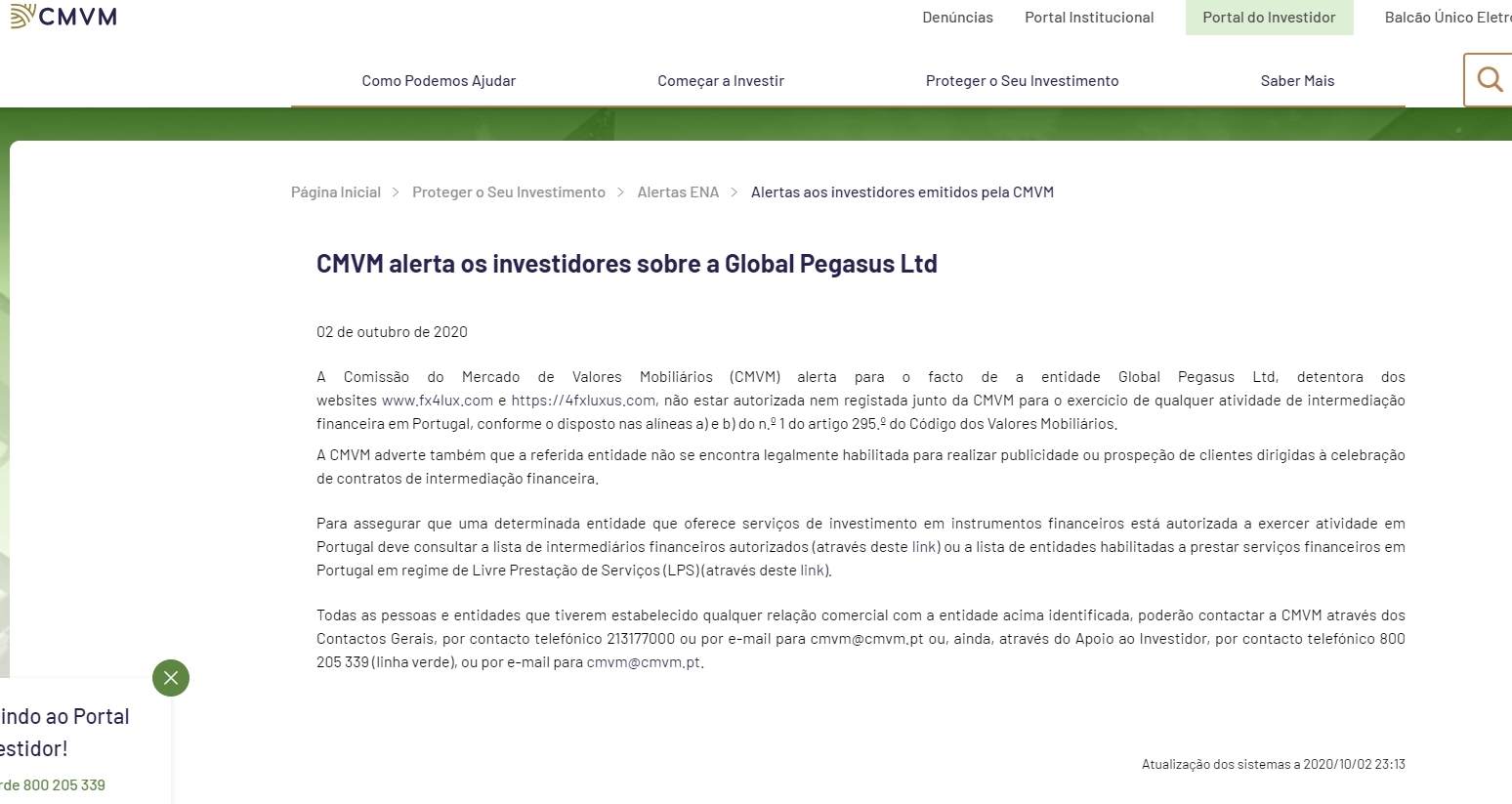 October 2, 2020 the securities market commission (cmvm) alerts to the fact that the entity Global Pegasus Ltd , owner of the websites www. FX4LUX .com and https:// 4FXLUXUS .com, is not authorized or registered with the cmvm to carry out any financial intermediation activity in Portugal, in accordance with the provisions of subparagraphs a) and b) of no. 1 of article 295 of the securities code. cmvm also warns that the aforementioned entity is not legally qualified to carry out advertising or prospecting for customers aimed at concluding financial intermediation contracts. To ensure that a given entity that offers investment services in financial instruments is authorized to carry out activities in Portugal, you must consult the list of authorized financial intermediaries (through this link) or the list of entities authorized to provide financial services in Portugal under a free regime provision of services (lps) (through this link). all people and entities that have established any commercial relationship with the entity identified above, may contact cmvm through general contacts, by telephone 213177000 or by email to cmvm@cmvm.pt or, even, through investor support , by telephone 800 205 339 (green line), or by email to cmvm@cmvm.pt. systems update on 2020/10/02 23:13