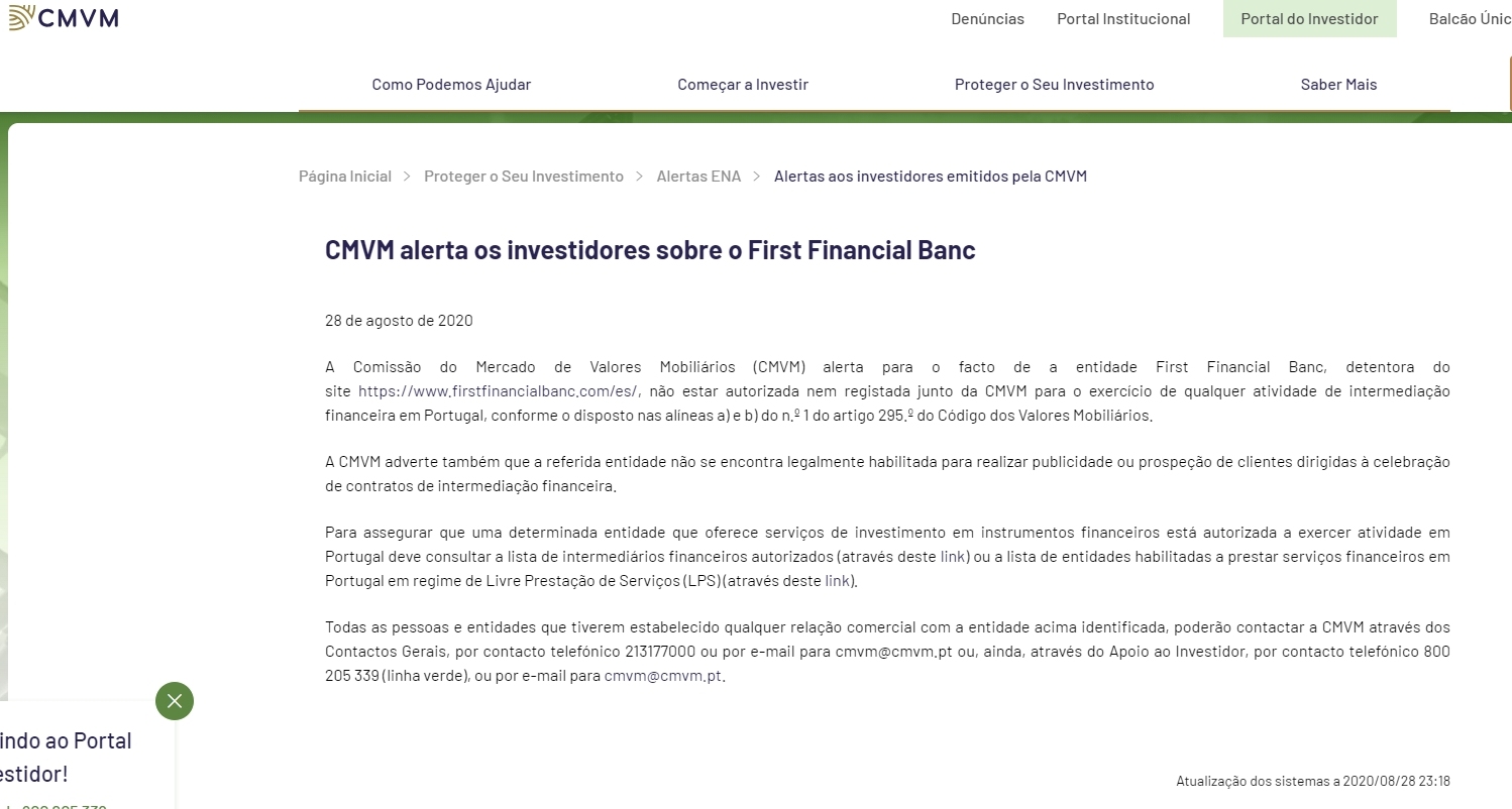 August 28, 2020, the securities market commission (cmvm) alerts to the fact that the entity First Financial Banc , owner of the website https://www.firstfinancialbanc.com/es/, is not authorized or registered with the cmvm to carry out any financial intermediation activity in Portugal, in accordance with the provisions of paragraphs a) and b) of no. 1 of article 295 of the securities code. cmvm also warns that the aforementioned entity is not legally qualified to carry out advertising or prospecting for customers aimed at concluding financial intermediation contracts. To ensure that a given entity that offers investment services in financial instruments is authorized to carry out activities in Portugal, you must consult the list of authorized financial intermediaries (through this link) or the list of entities authorized to provide financial services in Portugal under a free regime provision of services (lps) (through this link). all people and entities that have established any commercial relationship with the entity identified above, may contact cmvm through general contacts, by telephone 213177000 or by email to cmvm@cmvm.pt or, even, through investor support , by telephone 800 205 339 (green line), or by email to cmvm@cmvm.pt. systems update on 2020/08/28 23:18