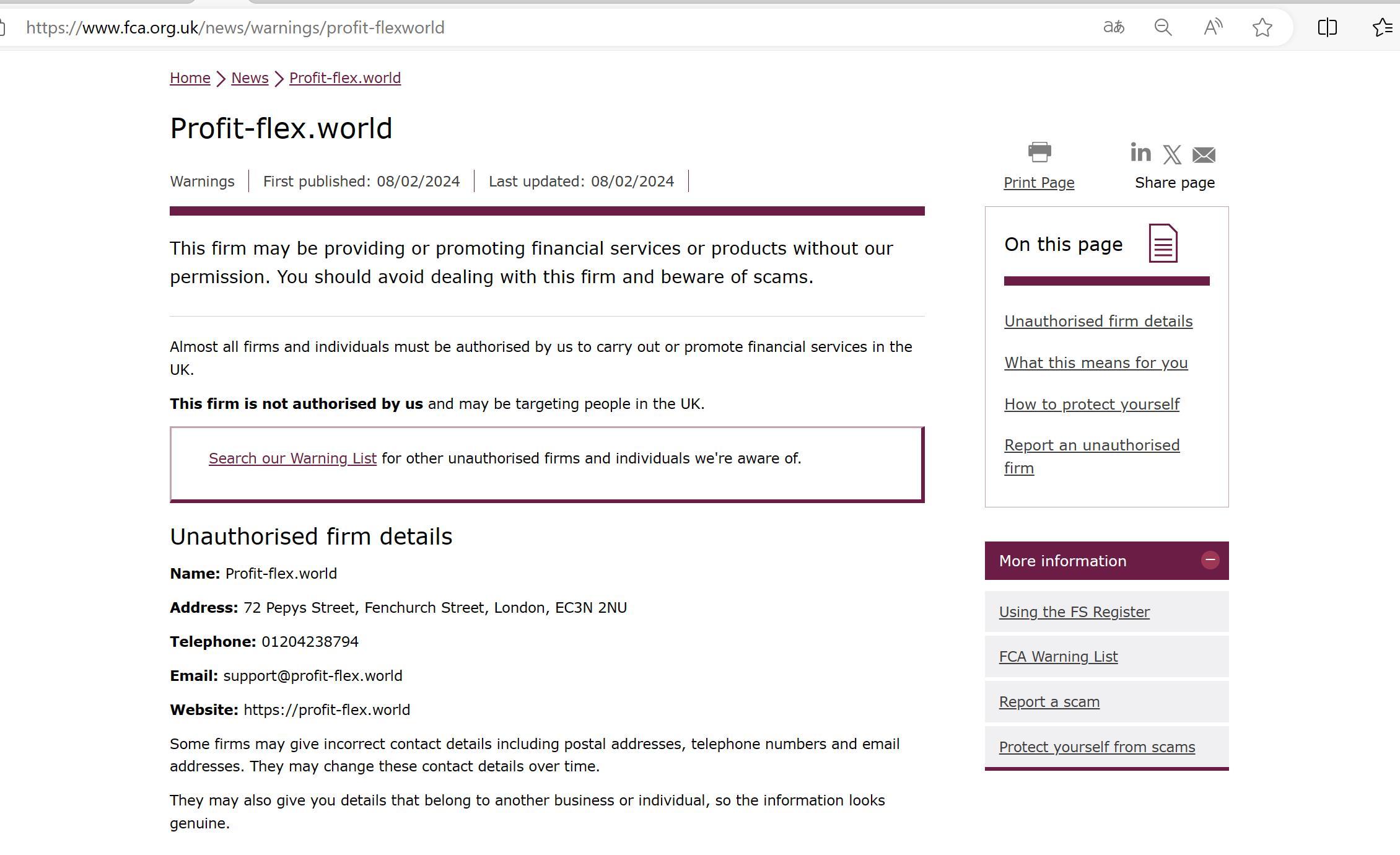 Warnings First published: 08/02/2024 Last updated: 08/02/2024 This firm may be providing or promoting financial services or products without our permission. You should avoid dealing with this firm and beware of scams. Almost all firms and individuals must be authorised by us to carry out or promote financial services in the UK. This firm is not authorised by us and may be targeting people in the UK. Search our Warning List for other unauthorised firms and individuals we're aware of. Unauthorised firm details Name: Profit-flex.world Address: 72 Pepys Street, Fenchurch Street, London, EC3N 2NU Telephone: 01204238794 Email: support@profit-flex.world Website: https://profit-flex.world Some firms may give incorrect contact details including postal addresses, telephone numbers and email addresses. They may change these contact details over time. They may also give you details that belong to another business or individual, so the information looks genuine.