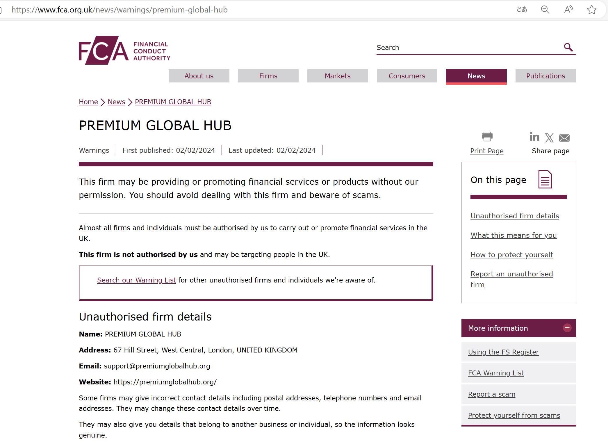 First published: 02/02/2024 Last updated: 02/02/2024 This firm may be providing or promoting financial services or products without our permission. You should avoid dealing with this firm and beware of scams. Almost all firms and individuals must be authorised by us to carry out or promote financial services in the UK. This firm is not authorised by us and may be targeting people in the UK. Search our Warning List for other unauthorised firms and individuals we're aware of. Unauthorised firm details Name: PREMIUM GLOBAL HUB Address: 67 Hill Street, West Central, London, UNITED KINGDOM Email: support@premiumglobalhub.org Website: https://premiumglobalhub.org/ Some firms may give incorrect contact details including postal addresses, telephone numbers and email addresses. They may change these contact details over time. They may also give you details that belong to another business or individual, so the information looks genuine.