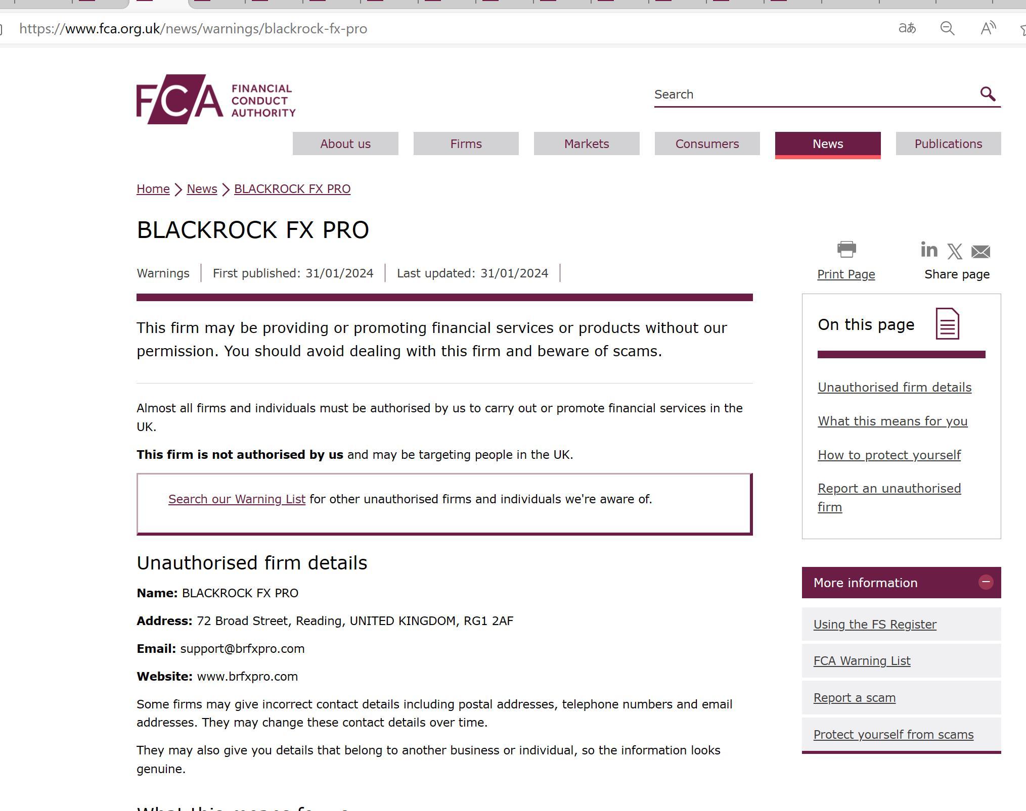 First published: 31/01/2024 Last updated: 31/01/2024 This firm may be providing or promoting financial services or products without our permission. You should avoid dealing with this firm and beware of scams. Almost all firms and individuals must be authorised by us to carry out or promote financial services in the UK. This firm is not authorised by us and may be targeting people in the UK. Search our Warning List for other unauthorised firms and individuals we're aware of. Unauthorised firm details Name: BLACKROCK FX PRO Address: 72 Broad Street, Reading, UNITED KINGDOM, RG1 2AF Email: support@brfxpro.com Website: www.brfxpro.com Some firms may give incorrect contact details including postal addresses, telephone numbers and email addresses. They may change these contact details over time. They may also give you details that belong to another business or individual, so the information looks genuine.