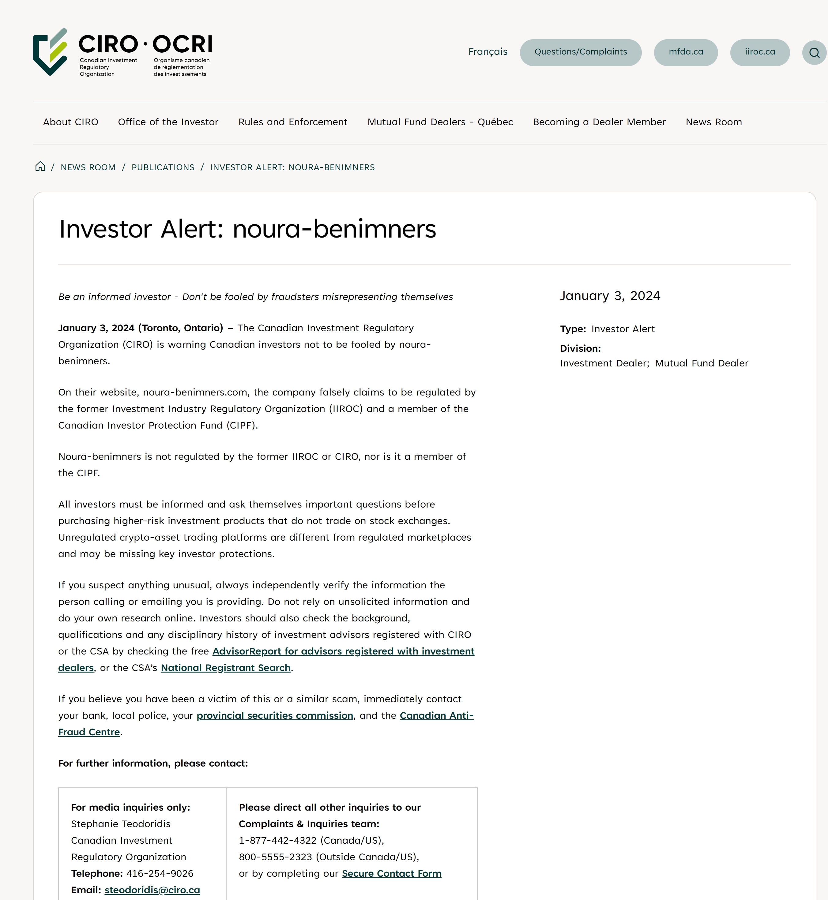 January 3, 2024 (Toronto, Ontario) – The Canadian Investment Regulatory Organization (CIRO) is warning Canadian investors not to be fooled by noura-benimners.