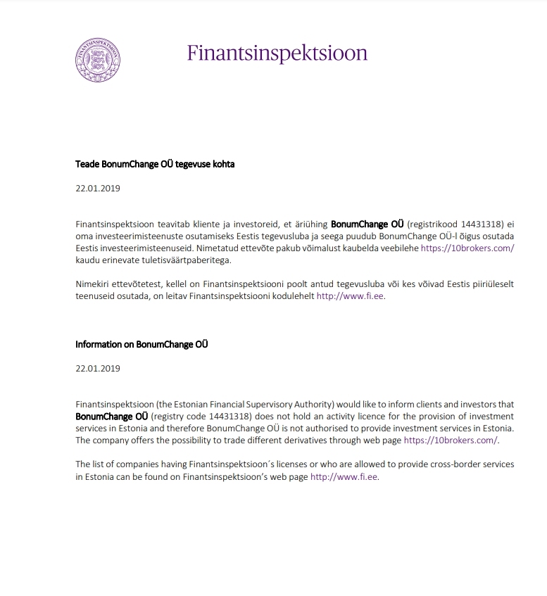 Investor alerts BonumChange OÜ (10brokers.com)