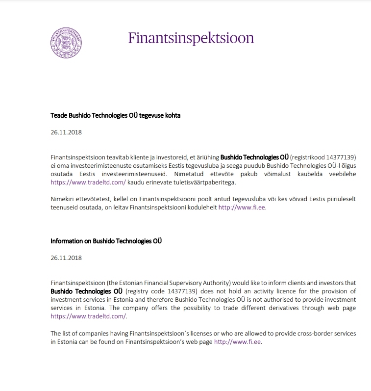Finantsinspektsioon teavitab kliente ja investoreid, et äriühing Bushido Technologies OÜ (registrikood 14377139)