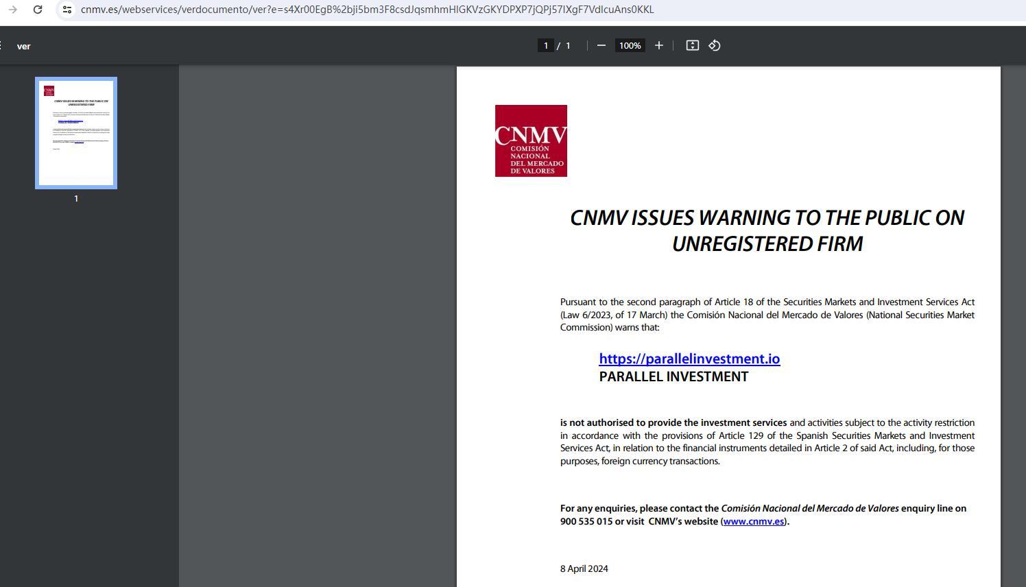 CNMV ISSUES WARNING TO THE PUBLIC ON UNREGISTERED FIRM Pursuant to the second paragraph of Article 18 of the Securities Markets and Investment Services Act (Law 6/2023, of 17 March) the Comisión Nacional del Mercado de Valores (National Securities Market Commission) warns that: https://parallelinvestment.io PARALLEL INVESTMENT is not authorised to provide the investment services and activities subject to the activity restriction in accordance with the provisions of Article 129 of the Spanish Securities Markets and Investment Services Act, in relation to the financial instruments detailed in Article 2 of said Act, including, for those purposes, foreign currency transactions. For any enquiries, please contact the Comisión Nacional del Mercado de Valores enquiry line on 900 535 015 or visit CNMV’s website (www.cnmv.es). 8 April 2024