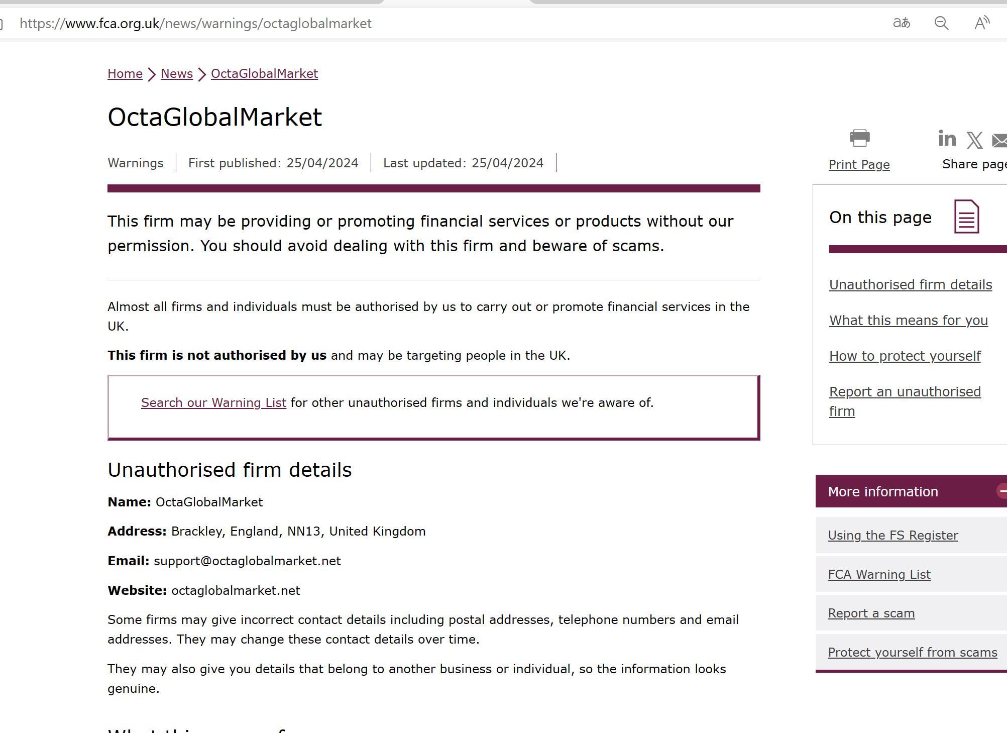 First published: 25/04/2024 Last updated: 25/04/2024 This firm may be providing or promoting financial services or products without our permission. You should avoid dealing with this firm and beware of scams. Almost all firms and individuals must be authorised by us to carry out or promote financial services in the UK. This firm is not authorised by us and may be targeting people in the UK. Search our Warning List for other unauthorised firms and individuals we're aware of. Unauthorised firm details Name: OctaGlobalMarket Address: Brackley, England, NN13, United Kingdom Email: support@octaglobalmarket.net Website: octaglobalmarket.net Some firms may give incorrect contact details including postal addresses, telephone numbers and email addresses. They may change these contact details over time. They may also give you details that belong to another business or individual, so the information looks genuine.