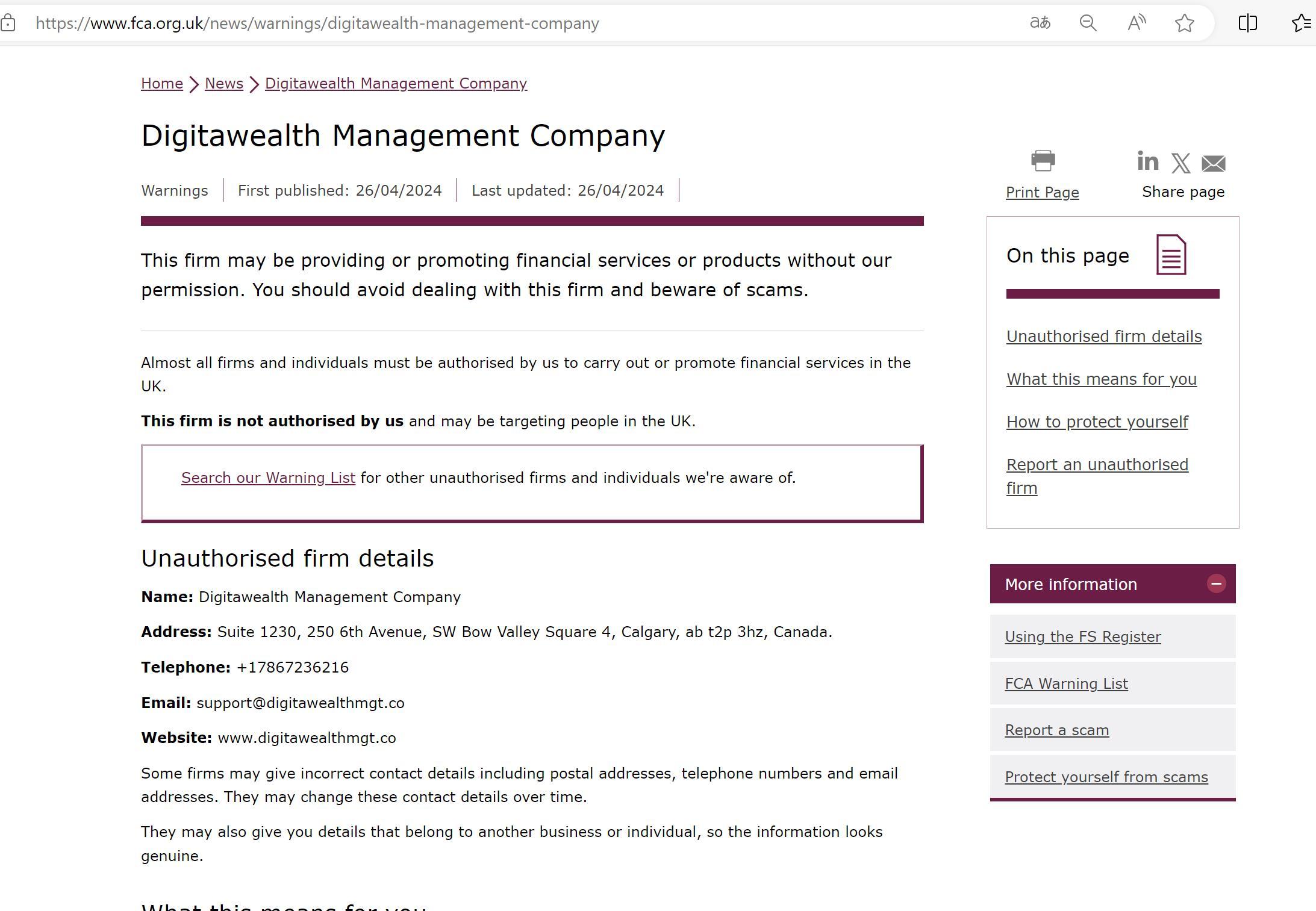 First published: 26/04/2024 Last updated: 26/04/2024 This firm may be providing or promoting financial services or products without our permission. You should avoid dealing with this firm and beware of scams. Almost all firms and individuals must be authorised by us to carry out or promote financial services in the UK. This firm is not authorised by us and may be targeting people in the UK. Search our Warning List for other unauthorised firms and individuals we're aware of. Unauthorised firm details Name: Digitawealth Management Company Address: Suite 1230, 250 6th Avenue, SW Bow Valley Square 4, Calgary, ab t2p 3hz, Canada. Telephone: +17867236216 Email: support@digitawealthmgt.co Website: www.digitawealthmgt.co Some firms may give incorrect contact details including postal addresses, telephone numbers and email addresses. They may change these contact details over time. They may also give you details that belong to another business or individual, so the information looks genuine.