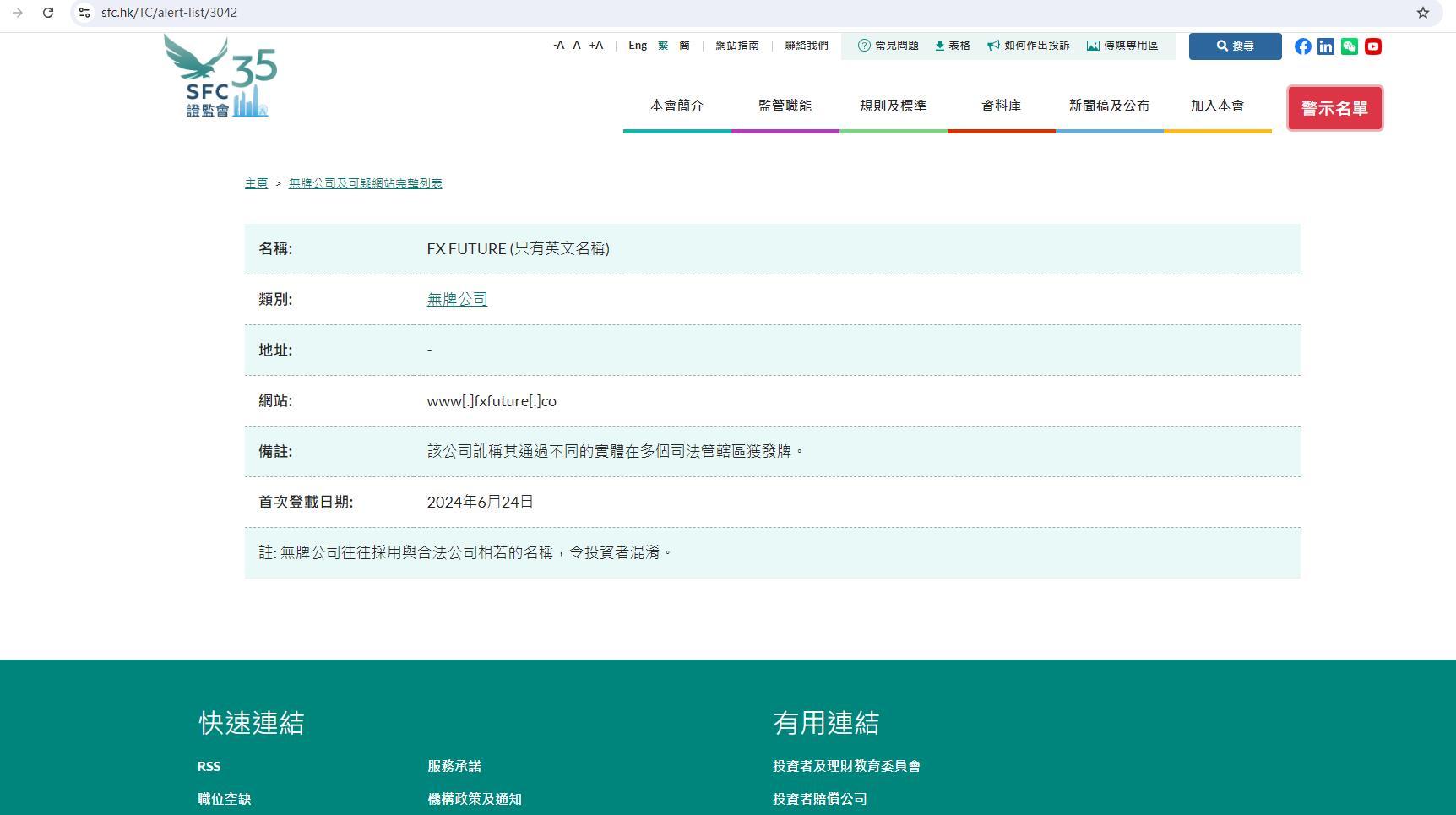 The list of unlicensed companies and suspicious websites lists companies that are not licensed in Hong Kong and have attracted the attention of the SFC. These companies are suspected to be currently or have been targeting Hong Kong investors, or claiming to have ties to Hong Kong. You can search by name or category to check whether a company is included in the list. This list is not exhaustive. As the Securities and Futures Commission often discovers companies or websites worth noting, we will add new names to the list from time to time. If you have been contacted by an unlicensed company, please use our online complaint form. For further information on boiler rooms, fraudulent websites and fake emails, please click on the relevant links. Note: The list of unlicensed companies and suspicious websites is intended to alert investors as early as possible. Investors should not rely solely on the information on the above list and should carefully check the details of individual companies themselves. Please select the first English letter of the name in each column to view the list, or click on the "Chinese Name" column to view companies with Chinese names only. name: FX FUTURE (English name only) Category: Unlicensed Company Address: - Website: www[.]fxfuture[.]co Note: The company falsely claims that it is licensed in multiple jurisdictions through different entities. Date first published: June 24, 2024 Note: Unlicensed companies often use names similar to legal companies, confusing investors.