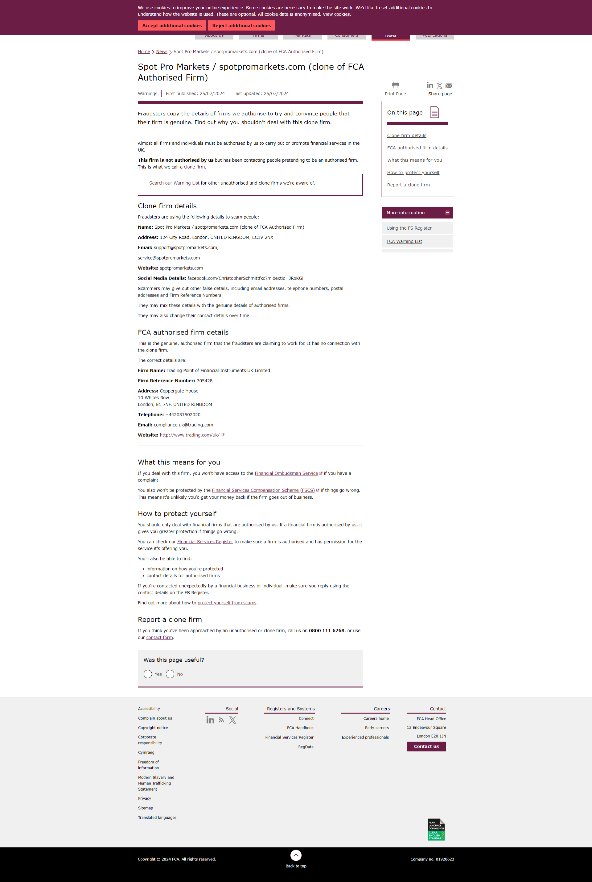 First published: 25/07/2024 Last updated: 25/07/2024 Fraudsters copy the details of firms we authorise to try and convince people that their firm is genuine. Find out why you shouldn’t deal with this clone firm. Almost all firms and individuals must be authorised by us to carry out or promote financial services in the UK. This firm is not authorised by us but has been contacting people pretending to be an authorised firm. This is what we call a clone firm. Search our Warning List for other unauthorised and clone firms we're aware of. Clone firm details Fraudsters are using the following details to scam people: Name: Spot Pro Markets / spotpromarkets.com (clone of FCA Authorised Firm) Address: 124 City Road, London, UNITED KINGDOM, EC1V 2NX Email: support@spotpromarkets.com, service@spotpromarkets.com Website: spotpromarkets.com Social Media Details: facebook.com/ChristopherSchmittfxc?mibextid=JRoKGi Scammers may give out other false details, including email addresses, telephone numbers, postal addresses and Firm Reference Numbers. They may mix these details with the genuine details of authorised firms. They may also change their contact details over time.