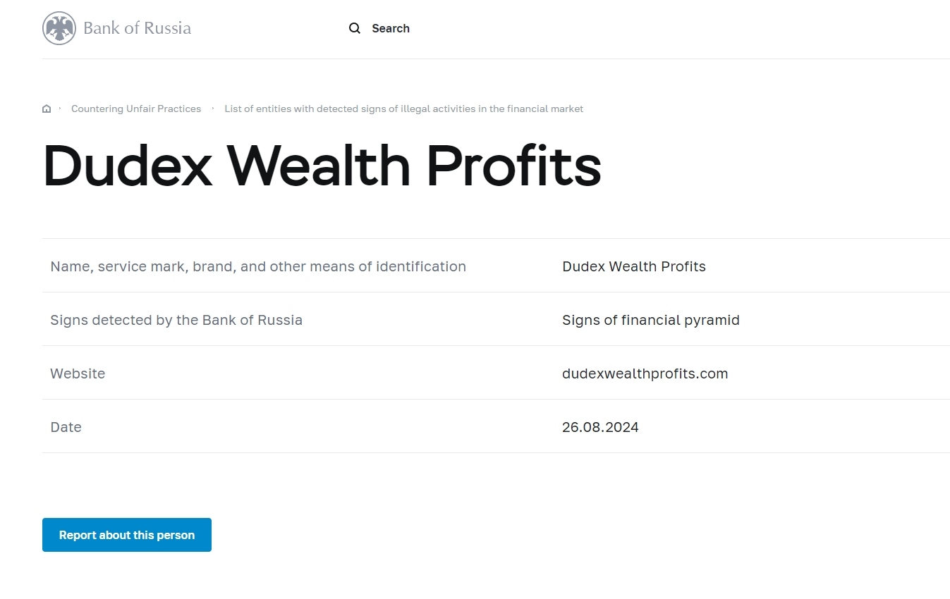 Name, service mark, brand, and other means of identification Dudex Wealth Profits Signs detected by the Bank of Russia Signs of financial pyramid Website dudexwealthprofits.com Date 26.08.2024