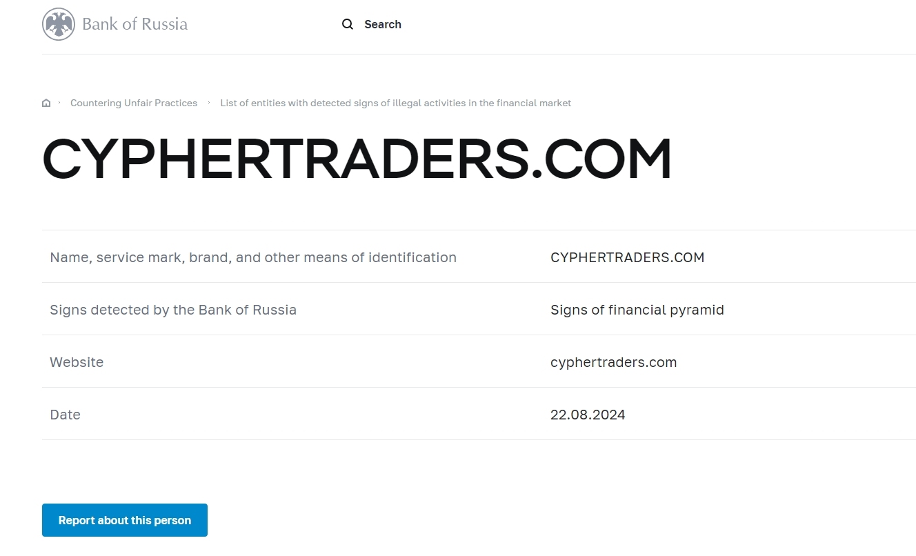 Name, service mark, brand, and other means of identification CYPHERTRADERS.COM Signs detected by the Bank of Russia Signs of financial pyramid Website cyphertraders.com Date 22.08.2024