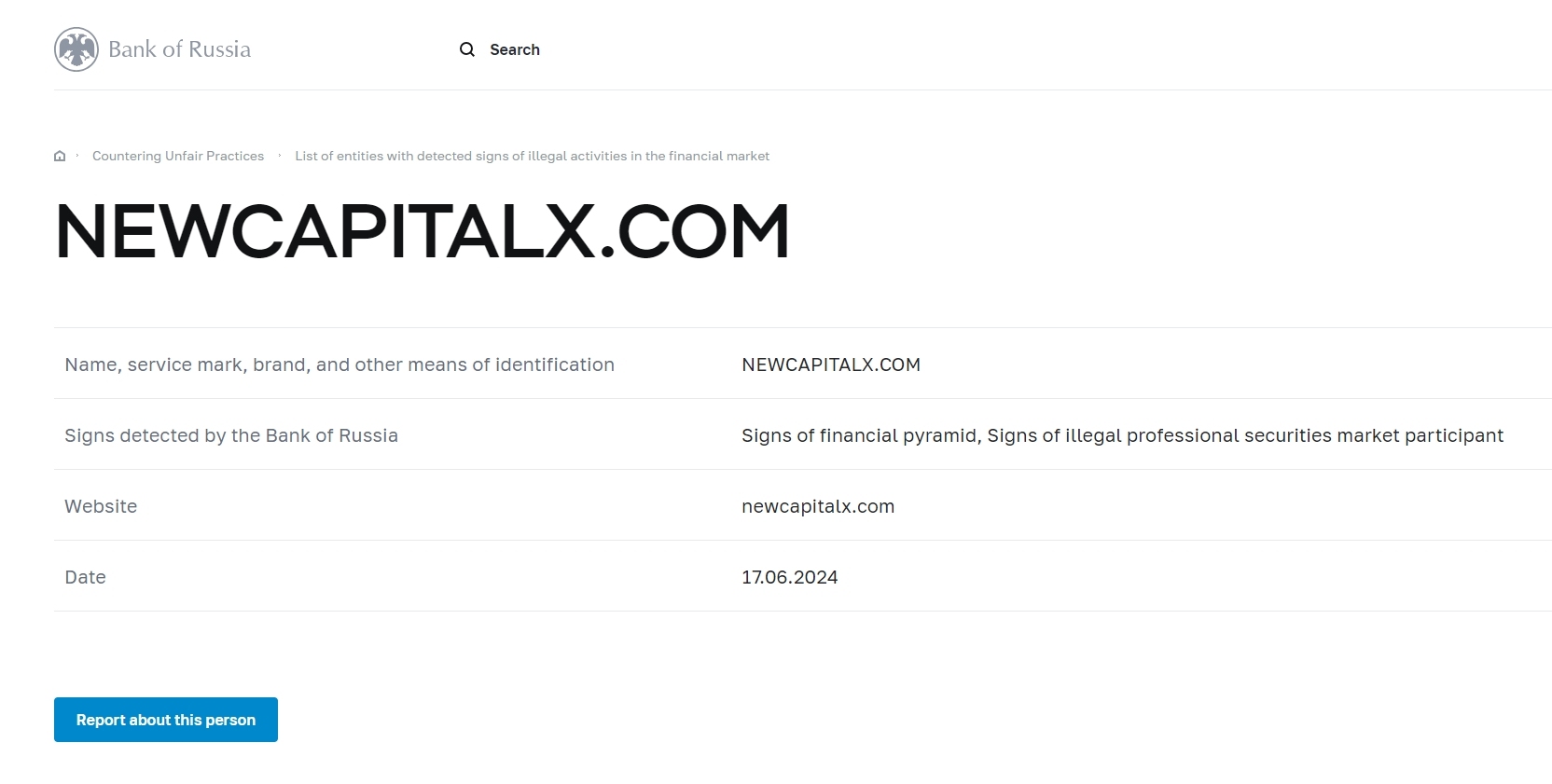 Name, service mark, brand, and other means of identification NEWCAPITALX.COM Signs detected by the Bank of Russia Signs of financial pyramid, Signs of illegal professional securities market participant Website newcapitalx.com Date 17.06.2024