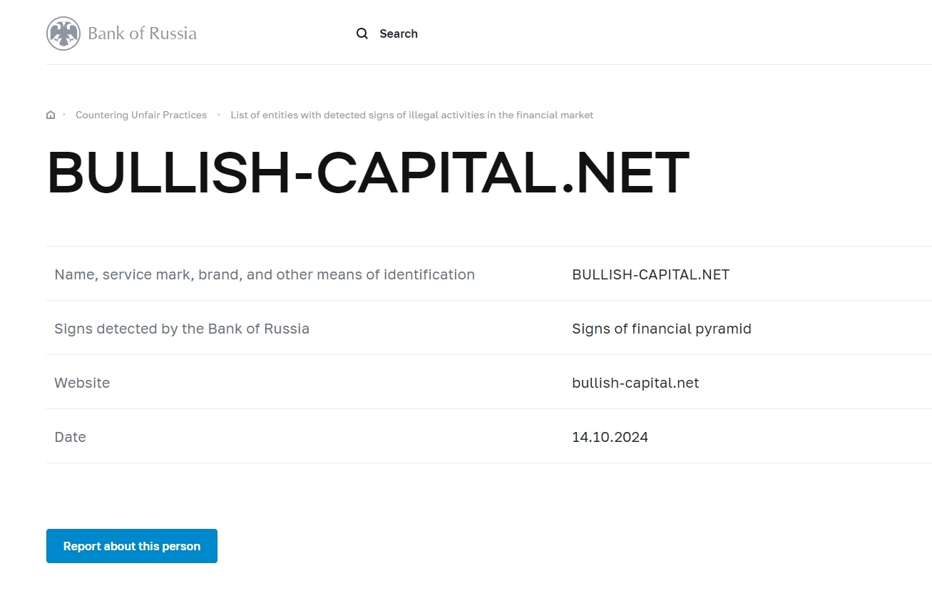 Name, service mark, brand, and other means of identification BULLISH-CAPITAL.NET Signs detected by the Bank of Russia Signs of financial pyramid Website bullish-capital.net Date 14.10.2024