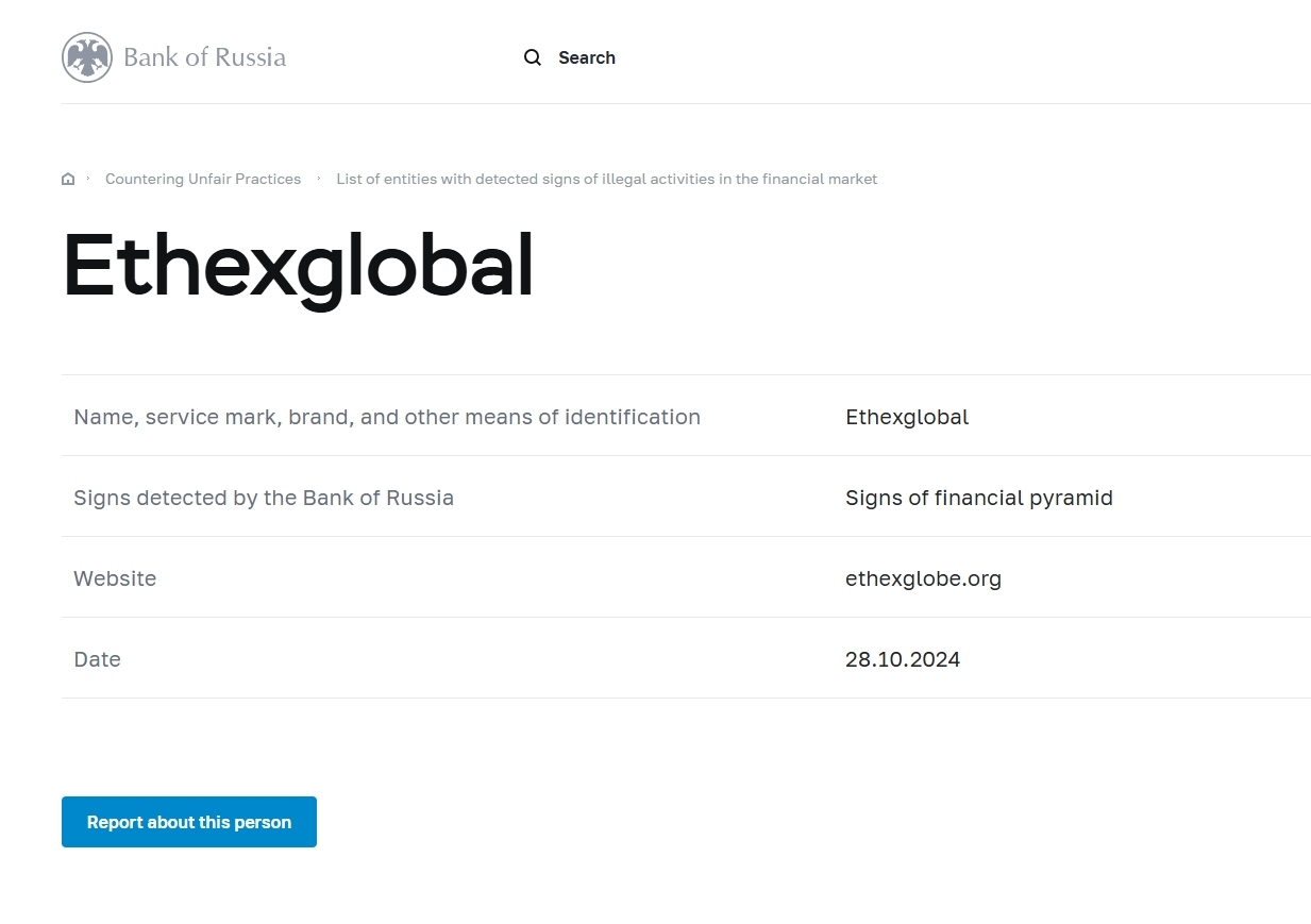 Name, service mark, brand, and other means of identification Ethexglobal Signs detected by the Bank of Russia Signs of financial pyramid Website ethexglobe.org Date 28.10.2024