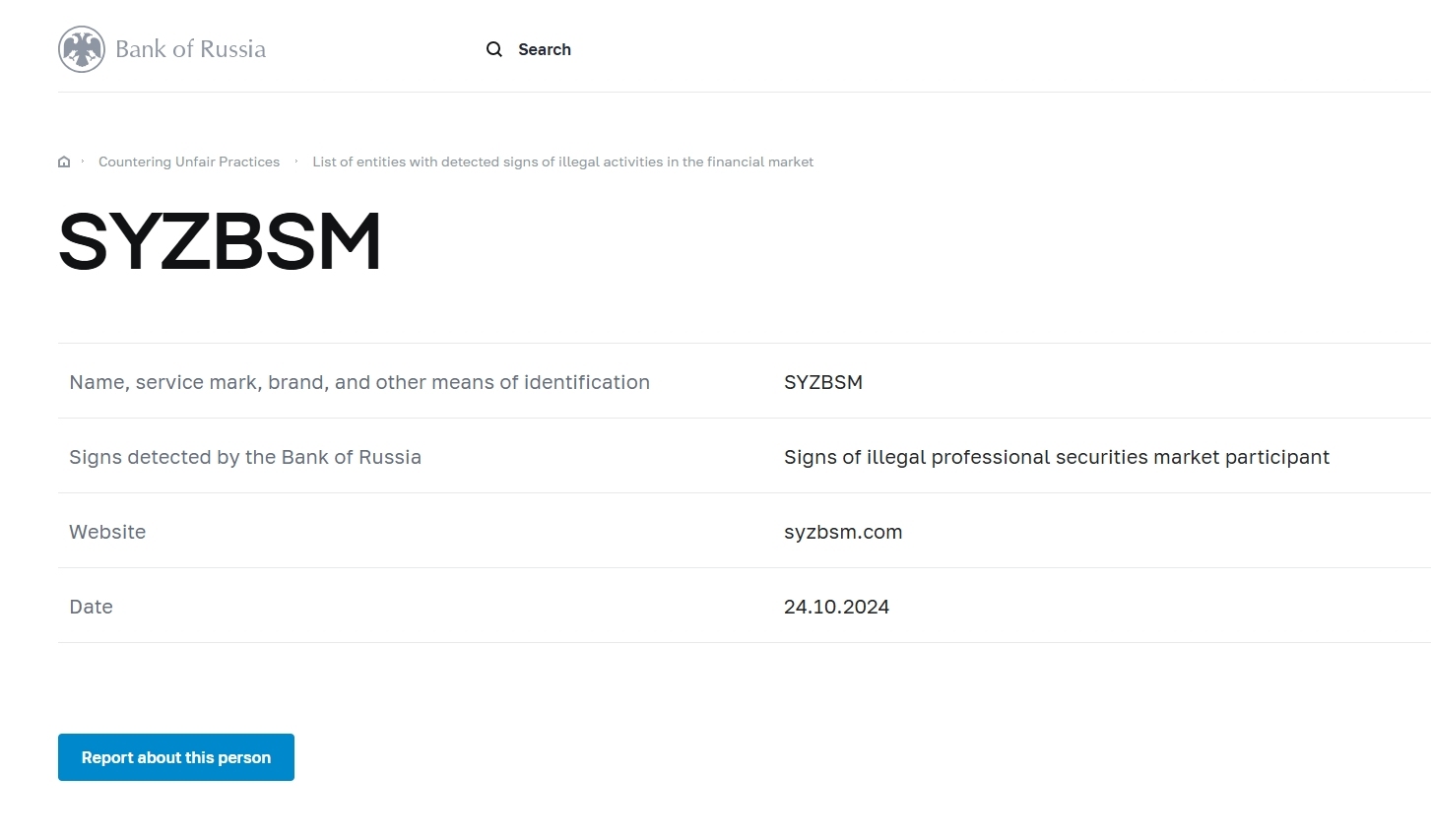 Name, service mark, brand, and other means of identification SYZBSM Signs detected by the Bank of Russia Signs of illegal professional securities market participant Website syzbsm.com Date 24.10.2024