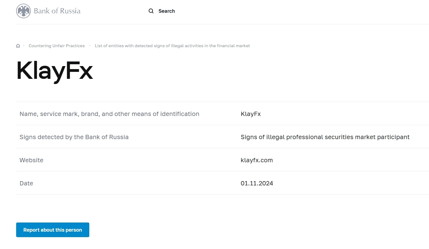 Name, service mark, brand, and other means of identification KlayFx Signs detected by the Bank of Russia Signs of illegal professional securities market participant Website klayfx.com Date 01.11.2024