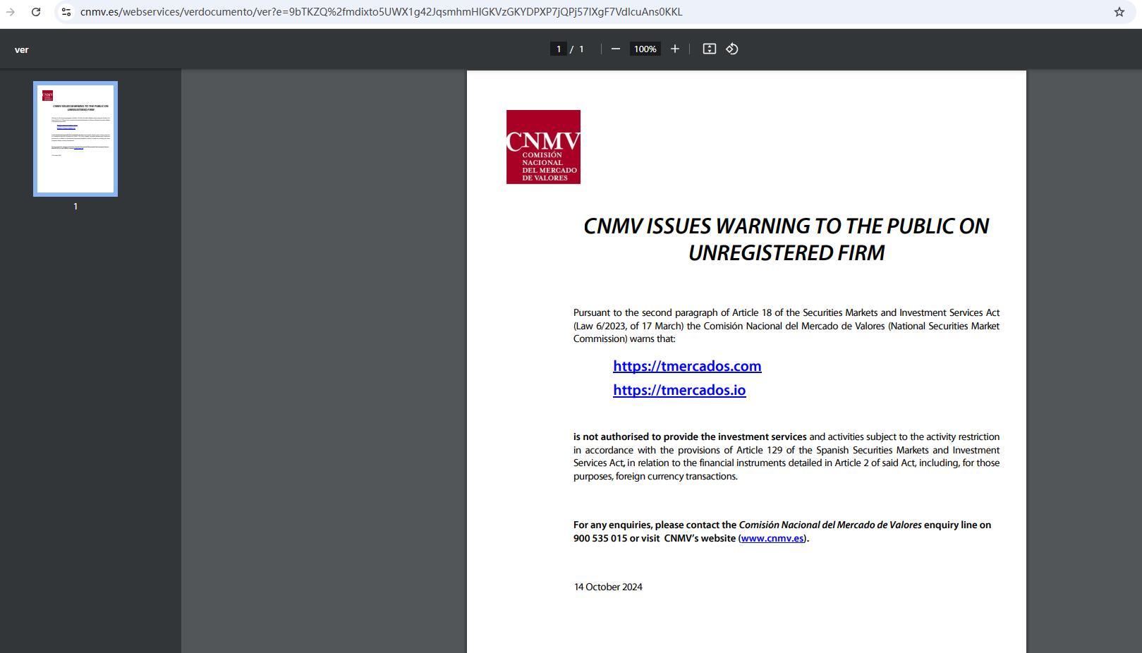 CNMV ISSUES WARNING TO THE PUBLIC ON UNREGISTERED FIRM Pursuant to the second paragraph of Article 18 of the Securities Markets and Investment Services Act (Law 6/2023, of 17 March) the Comisión Nacional del Mercado de Valores (National Securities Market Commission) warns that: https://tmercados.com/ https://tmercados.io/ is not authorised to provide the investment services and activities subject to the activity restriction in accordance with the provisions of Article 129 of the Spanish Securities Markets and Investment Services Act, in relation to the financial instruments detailed in Article 2 of said Act, including, for those purposes, foreign currency transactions. For any enquiries, please contact the Comisión Nacional del Mercado de Valores enquiry line on 900 535 015 or visit CNMV’s website (www.cnmv.es). 14 October 2024