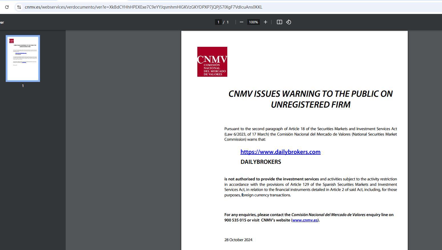 CNMV ISSUES WARNING TO THE PUBLIC ON UNREGISTERED FIRM Pursuant to the second paragraph of Article 18 of the Securities Markets and Investment Services Act (Law 6/2023, of 17 March) the Comisión Nacional del Mercado de Valores (National Securities Market Commission) warns that: https://www.dailybrokers.com DAILYBROKERS is not authorised to provide the investment services and activities subject to the activity restriction in accordance with the provisions of Article 129 of the Spanish Securities Markets and Investment Services Act, in relation to the financial instruments detailed in Article 2 of said Act, including, for those purposes, foreign currency transactions. For any enquiries, please contact the Comisión Nacional del Mercado de Valores enquiry line on 900 535 015 or visit CNMV’s website (www.cnmv.es). 28 October 2024