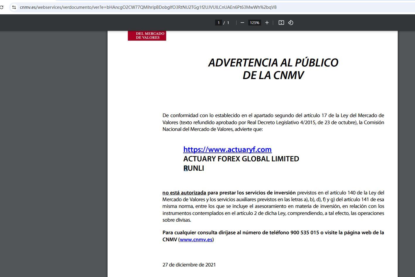 • Reason for punishment https://www.actuaryf.com Actuary Forex Global Limited runli is not authorized to provide the investment services provided for in article 140 of the securities market law and the auxiliary services provided for in letters a), b), d), f) and g) of article 141 of the same law.