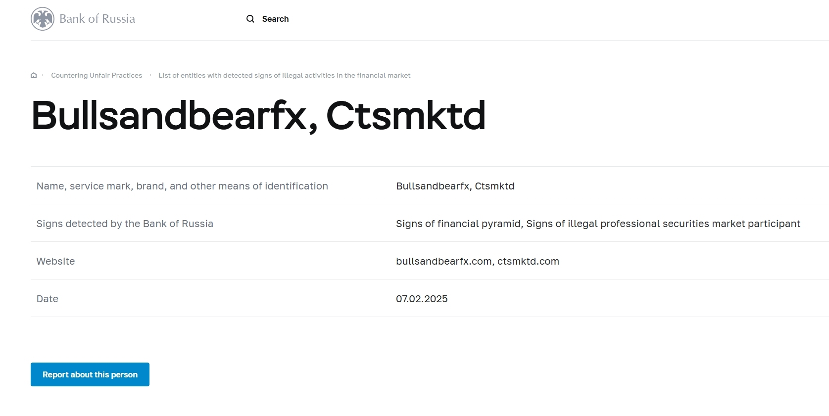 Name, service mark, brand, and other means of identification Bullsandbearfx, Ctsmktd Signs detected by the Bank of Russia Signs of financial pyramid, Signs of illegal professional securities market participant Website bullsandbearfx.com, ctsmktd.com Date 07.02.2025