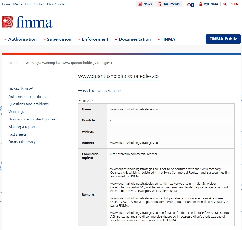 www.quantusholdingsstrategies.co ne doit pas être confondu avec la société suisse Quantus AG, inscrite au registre du commerce et qui est une maison de titres autorisée par la FINMA.