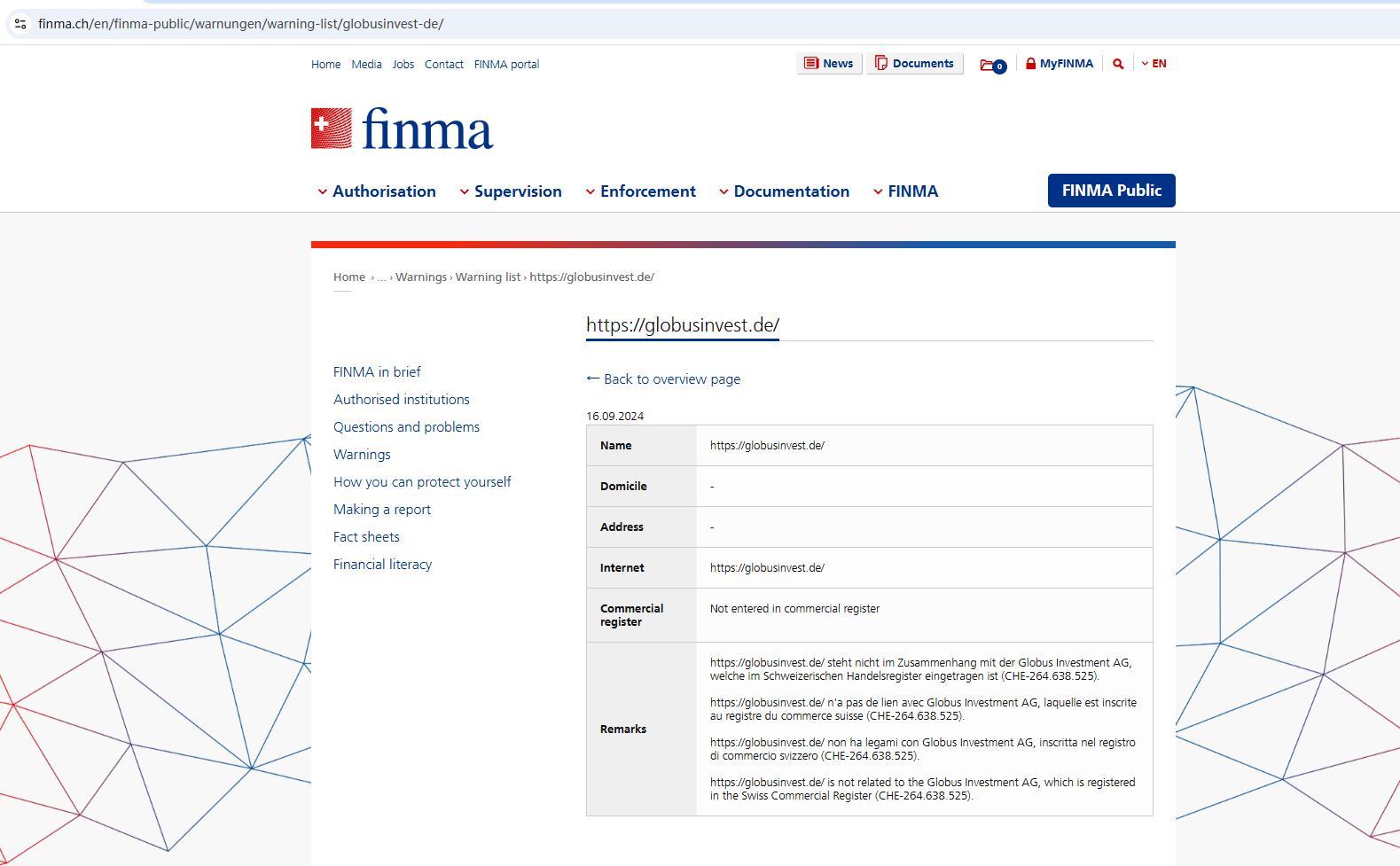 Warning list of unauthorised companies and individuals https://globusinvest.de/
