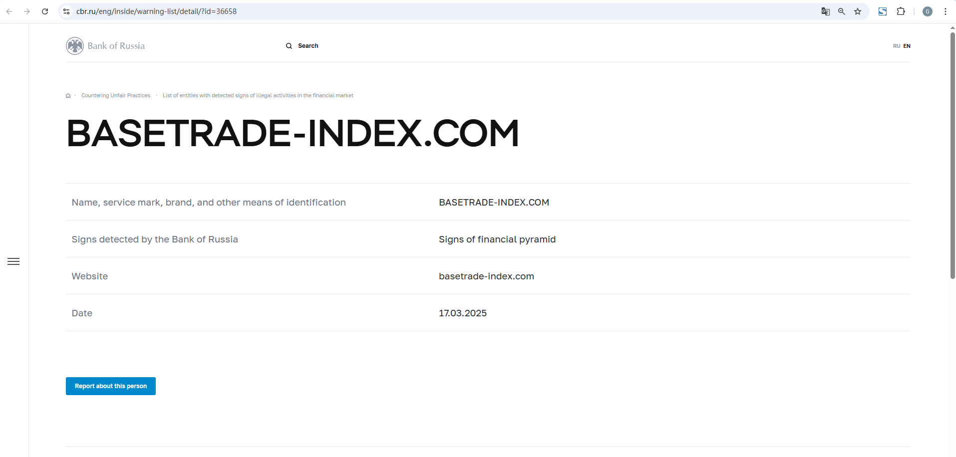 Name, service mark, brand, and other means of identification BASETRADE-INDEX.COM Signs detected by the Bank of Russia Signs of financial pyramid Website basetrade-index.com Date 17.03.2025