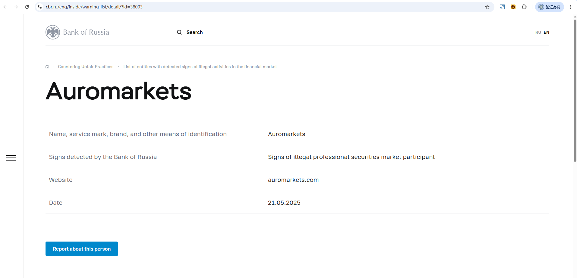 Name, service mark, brand, and other means of identification Auromarkets Signs detected by the Bank of Russia Signs of illegal professional securities market participant Website auromarkets.com Date 21.05.2025