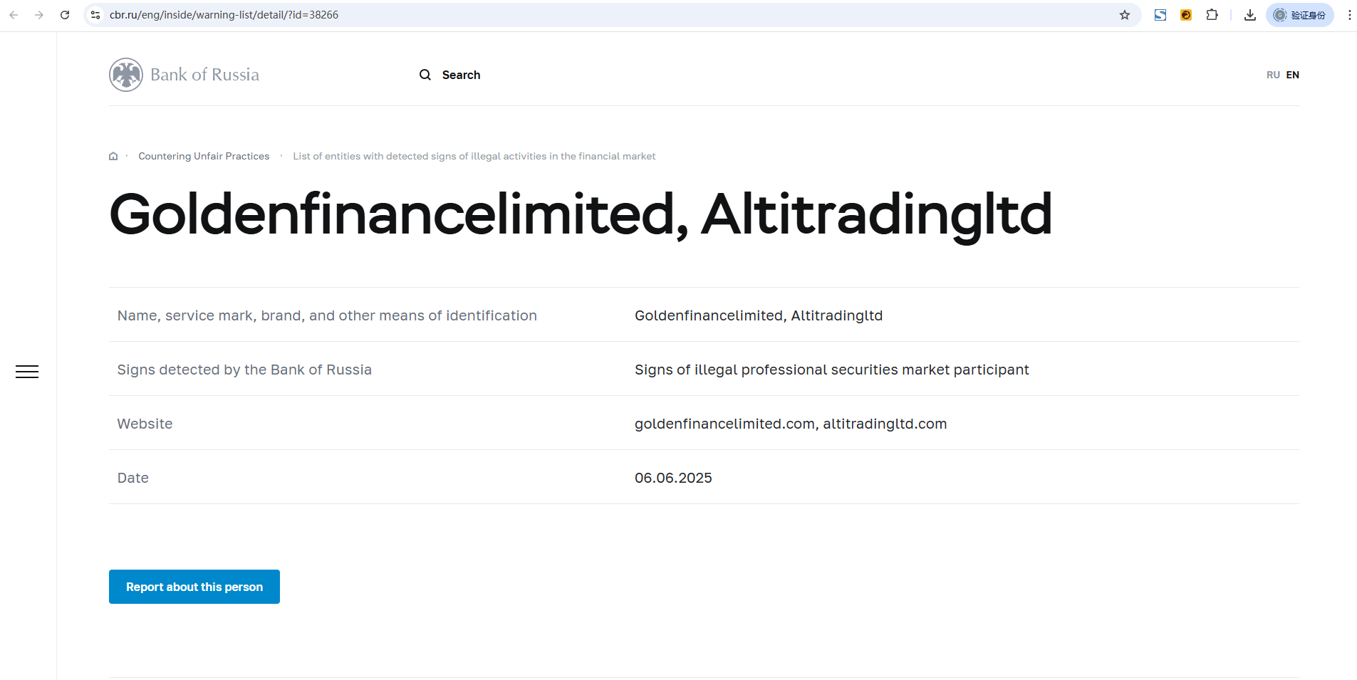 Name, service mark, brand, and other means of identification Goldenfinancelimited, Altitradingltd Signs detected by the Bank of Russia Signs of illegal professional securities market participant Website goldenfinancelimited.com, altitradingltd.com Date 06.06.2025
