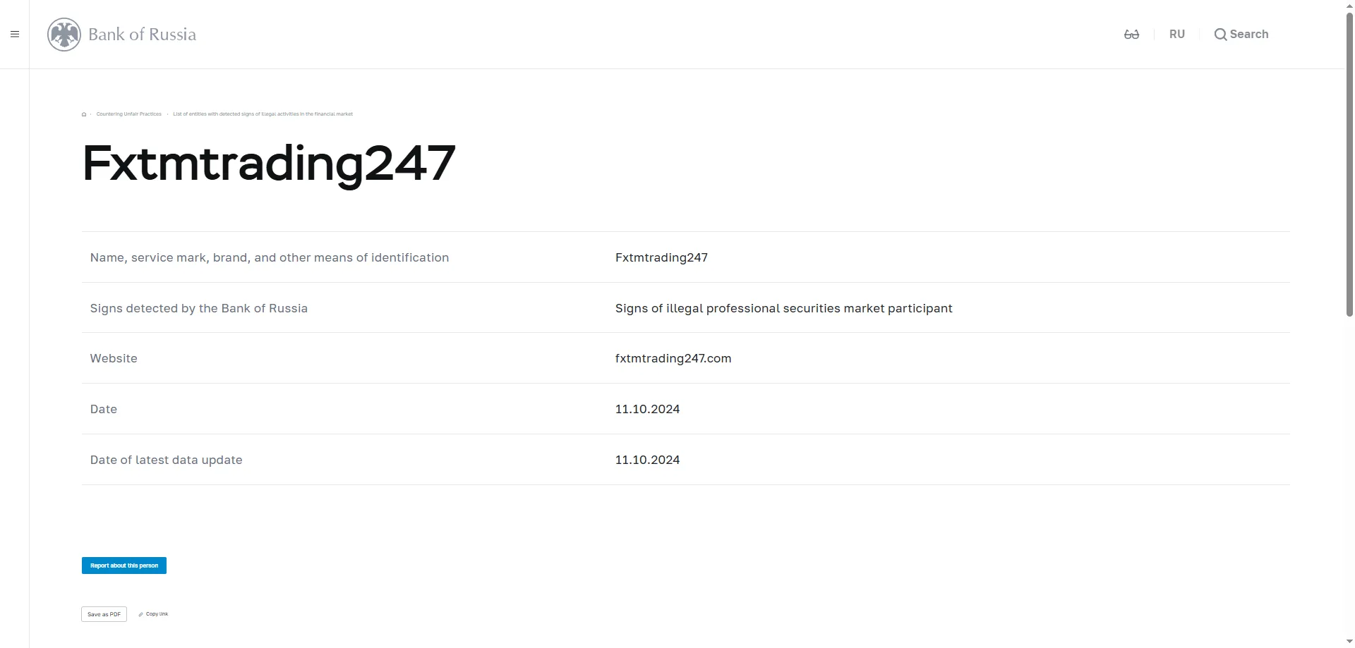 Name, service mark, brand, and other means of identification Fxtmtrading247 Signs detected by the Bank of Russia Signs of illegal professional securities market participant Website fxtmtrading247.com Date 11.10.2024 Date of latest data update 11.10.2024
