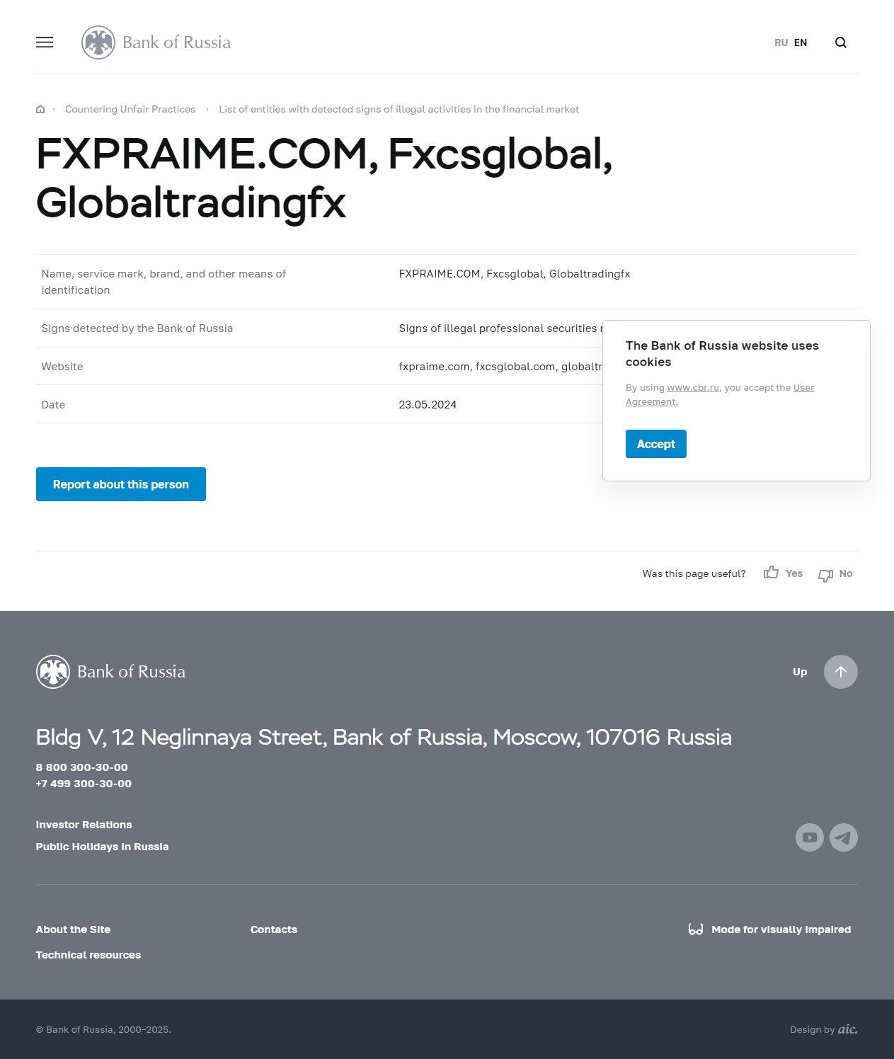 Name, service mark, brand, and other means of identification FXPRAIME.COM, Fxcsglobal, Globaltradingfx Signs detected by the Bank of Russia Signs of illegal professional securities market participant Website fxpraime.com, fxcsglobal.com, globaltradingfx.com Date 23.05.2024