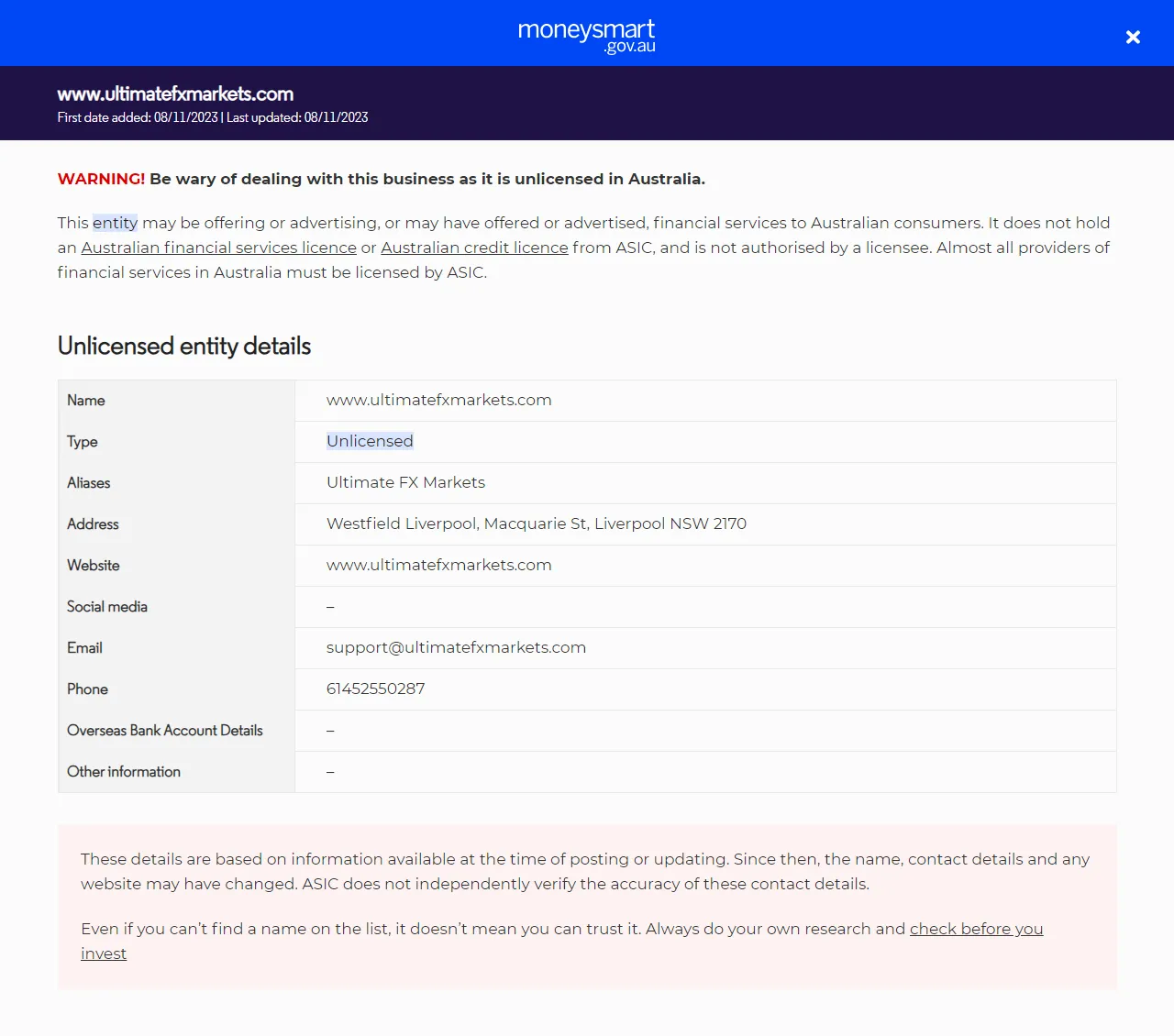 Namewww.ultimatefxmarkets.com TypeUnlicensedOffering financial services (including financial products) to people in Australia without a licence. They do not hold an Australianfinancialservices(AFS)licence or Australiancreditlicence from ASIC. AliasesUltimate FX Markets AddressWestfield Liverpool, Macquarie St, Liverpool NSW 2170 Websitewww.ultimatefxmarkets.com Social media– Emailsupport@ultimatefxmarkets.com Phone61452550287 Overseas Bank Account Details– Other information–