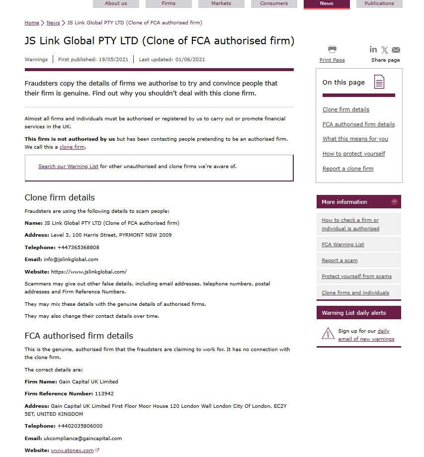 ['Fraudsters copy the details of firms we authorise to try and convince people that their firm is genuine. Find out why you shouldn’t deal with this clone firm. On this page Clone firm detailsFCA authorised firm details', "How to protect yourselfReport a clone firm Almost all firms and individuals must be authorised or registered by us to carry out or promote financial services in the UK. This firm is not authorised by us but has been contacting people pretending to be an authorised firm. We call this a clone firm. Search our Warning List for other unauthorised and clone firms we're aware of. Clone firm details Fraudsters are using the following details to scam people: Name: JS Link Global PTY LTD (Clone of FCA authorised firm) Address: Level 3, 100 Harris Street, PYRMONT NSW 2009 Telephone: +447365368808 Email: info@jslinkglobal.com Website: https://www.jslinkglobal.com/ Scammers may give out other false details, including email addresses, telephone numbers, postal addresses and Firm Reference Numbers. They may mix these details with the genuine details of authorised firms. They may also change their contact details over time. FCA authorised firm details This is the genuine, authorised firm that the fraudsters are claiming to work for. It has no connection with the clone firm. The correct details are: Firm Name: Gain Capital UK Limited Firm Reference Number: 113942 Address: Gain Capital UK Limited First Floor Moor House 120 London Wall London City Of London, EC2Y 5ET, UNITED KINGDOM Telephone: +4402035806000 Email: ukcompliance@gaincapital.com Website: www.stonex.com "]