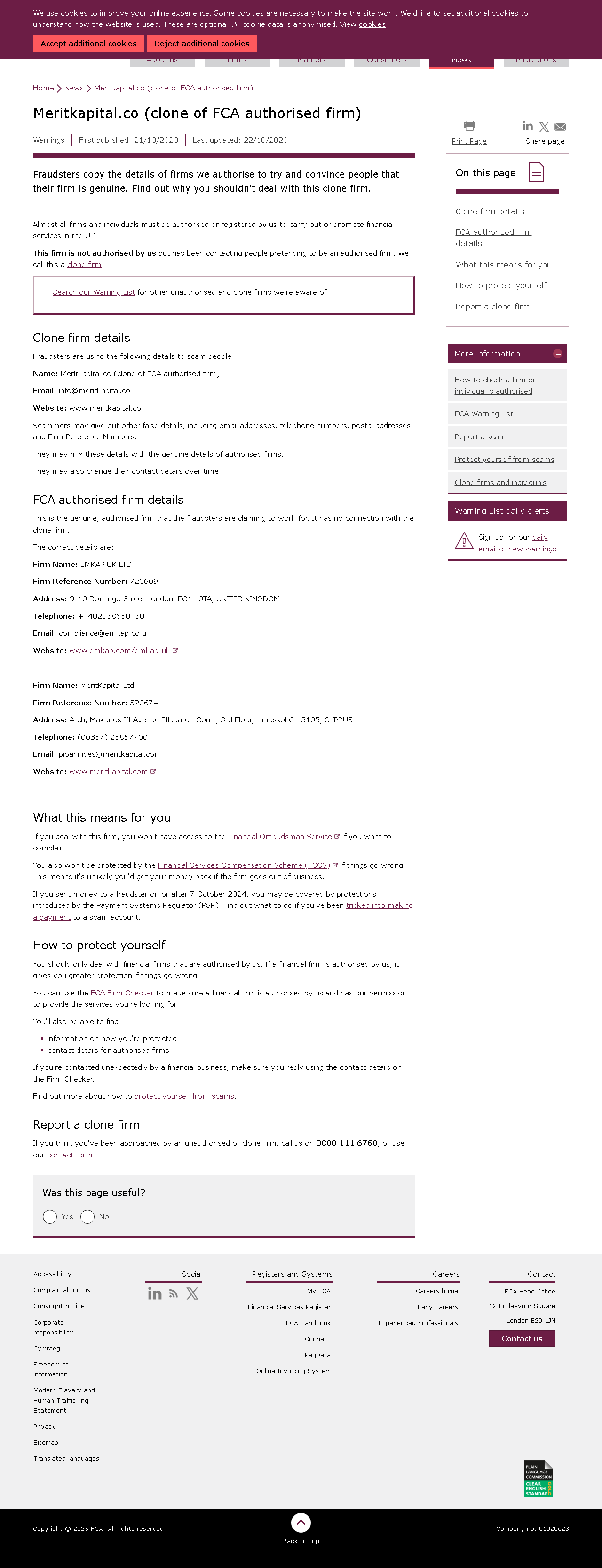['Fraudsters copy the details of firms we authorise to try and convince people that their firm is genuine. Find out why you shouldn’t deal with this clone firm. On this page Clone firm detailsFCA authorised firm details', "How to protect yourselfReport a clone firm Almost all firms and individuals must be authorised or registered by us to carry out or promote financial services in the UK. This firm is not authorised by us but has been contacting people pretending to be an authorised firm. We call this a clone firm. Search our Warning List for other unauthorised and clone firms we're aware of. Clone firm details Fraudsters are using the following details to scam people: Name: Meritkapital.co (clone of FCA authorised firm) Email: info@meritkapital.co Website: www.meritkapital.co Scammers may give out other false details, including email addresses, telephone numbers, postal addresses and Firm Reference Numbers. They may mix these details with the genuine details of authorised firms. They may also change their contact details over time. FCA authorised firm details This is the genuine, authorised firm that the fraudsters are claiming to work for. It has no connection with the clone firm. The correct details are: Firm Name: EMKAP UK LTD Firm Reference Number: 720609 Address: 9-10 Domingo Street London, EC1Y 0TA, UNITED KINGDOM Telephone: +4402038650430 Email: compliance@emkap.co.uk Website: www.emkap.com/emkap-uk Firm Name: MeritKapital Ltd Firm Reference Number: 520674 Address: Arch, Makarios III Avenue Eflapaton Court, 3rd Floor, Limassol CY-3105, CYPRUS Telephone: (00357) 25857700 Email: pioannides@meritkapital.com Website: www.meritkapital.com "]