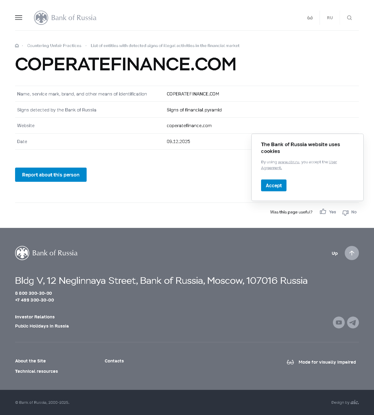 Name, service mark, brand, and other means of identification COPERATEFINANCE.COM Signs detected by the Bank of Russia Signs of financial pyramid Website coperatefinance.com Date 09.12.2025