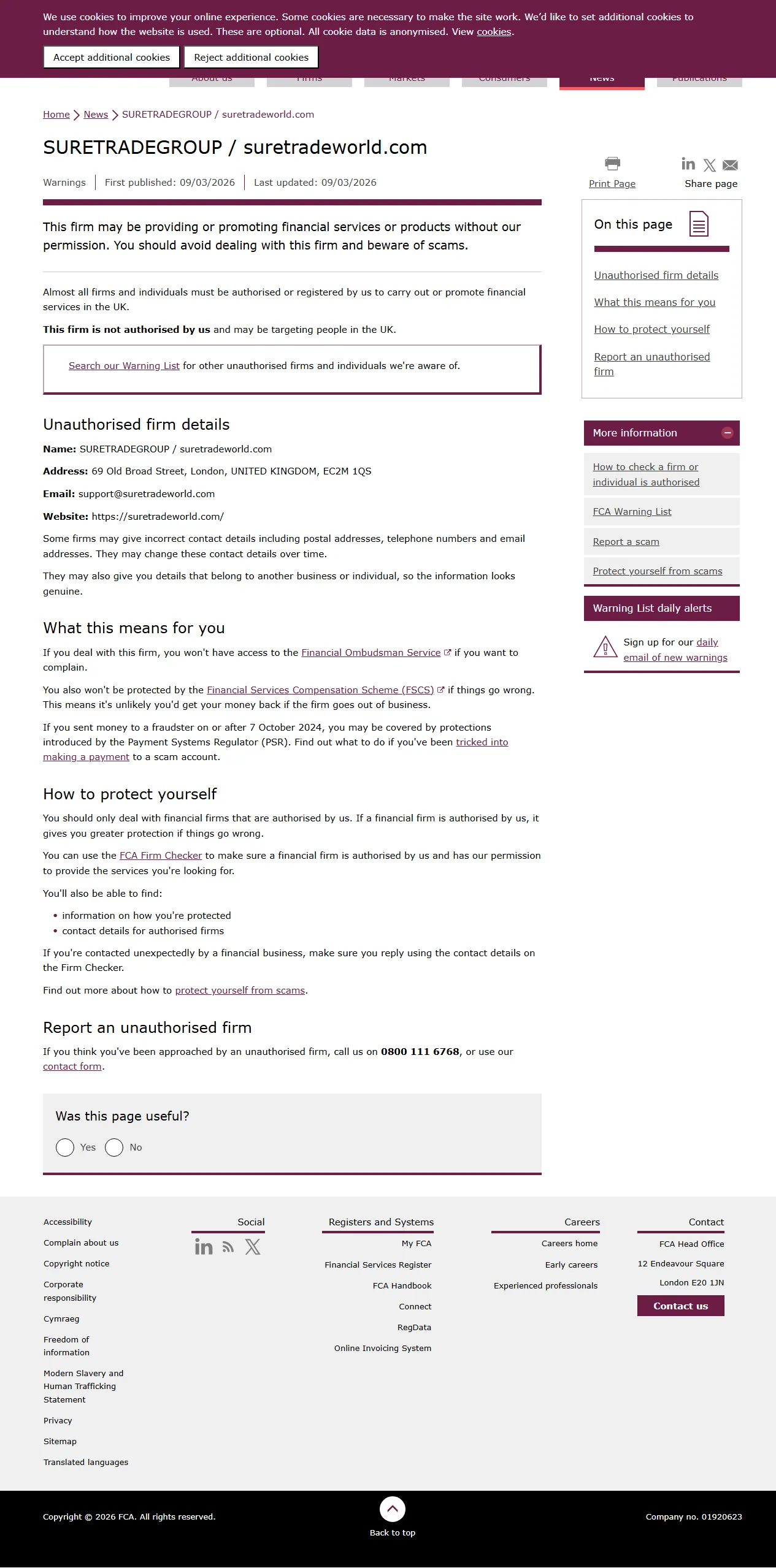 FCA Warning List of unauthorised firms SURETRADEGROUP / suretradeworld.com
